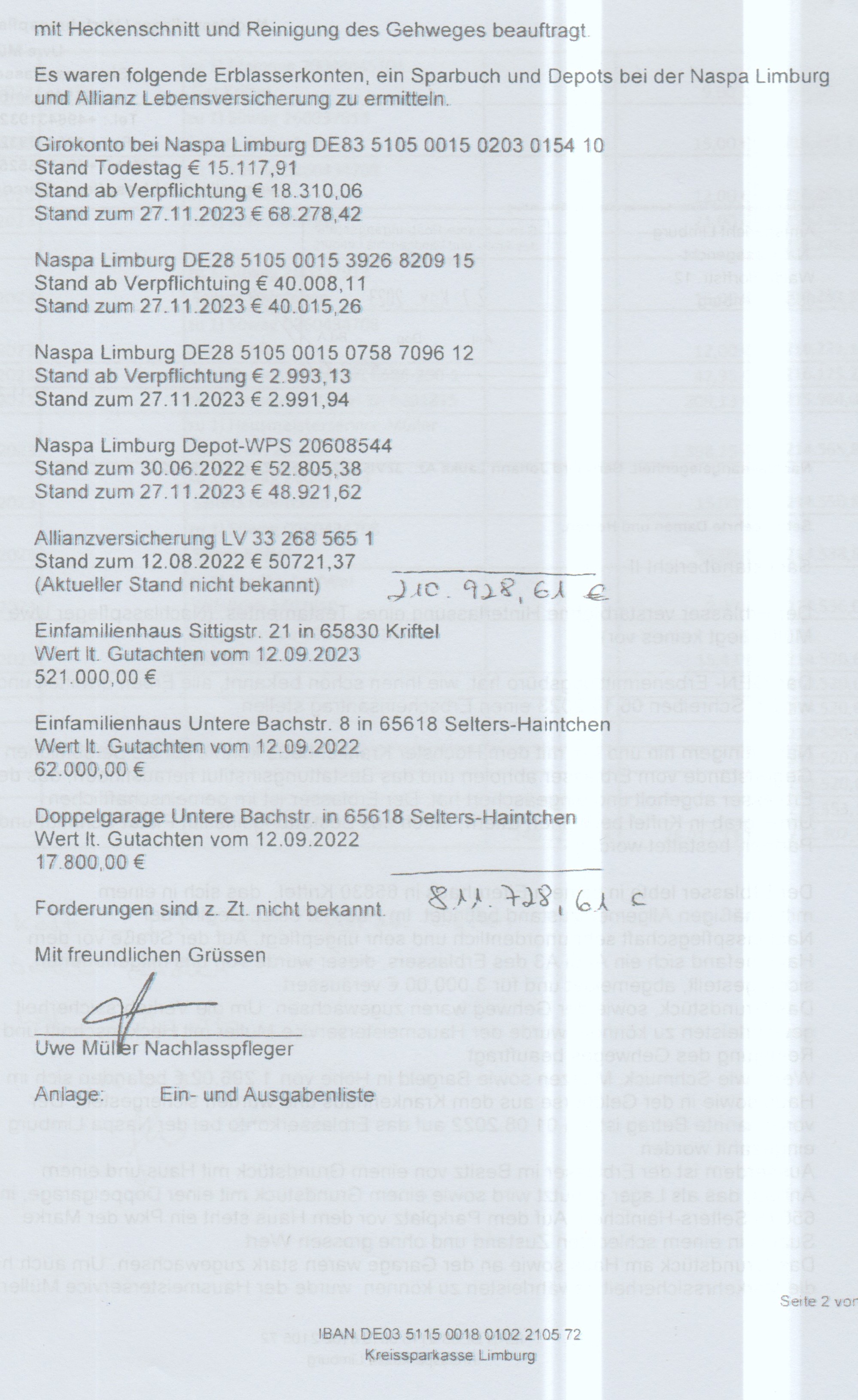 Statt dessen möchten wir dem ( Team Scholl – Wyrwa* ) vorschlagen, dass es dem Nachlasspfleger ( Hausmeister Uwe Müller* ) erlaubt, die Immobilien jetzt zu verkaufen. ( wofür Müller schon Gefälligkeitsgutachten in Höhe 600.800 € eingeholt hatte* )…. und dann unterschlägt uns das Gericht die nächste Seite des Schreibens – warum? – Warum wohl?
