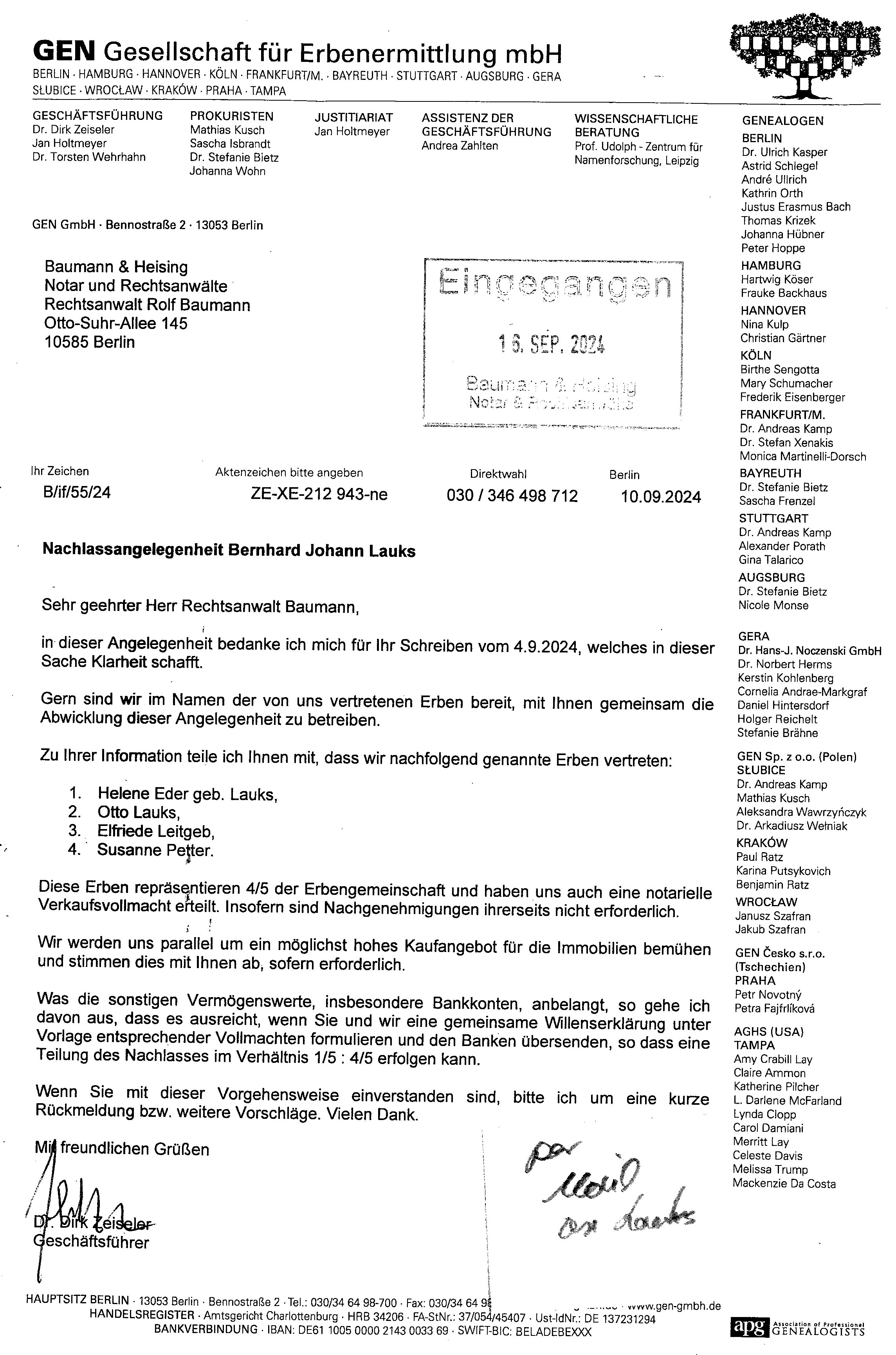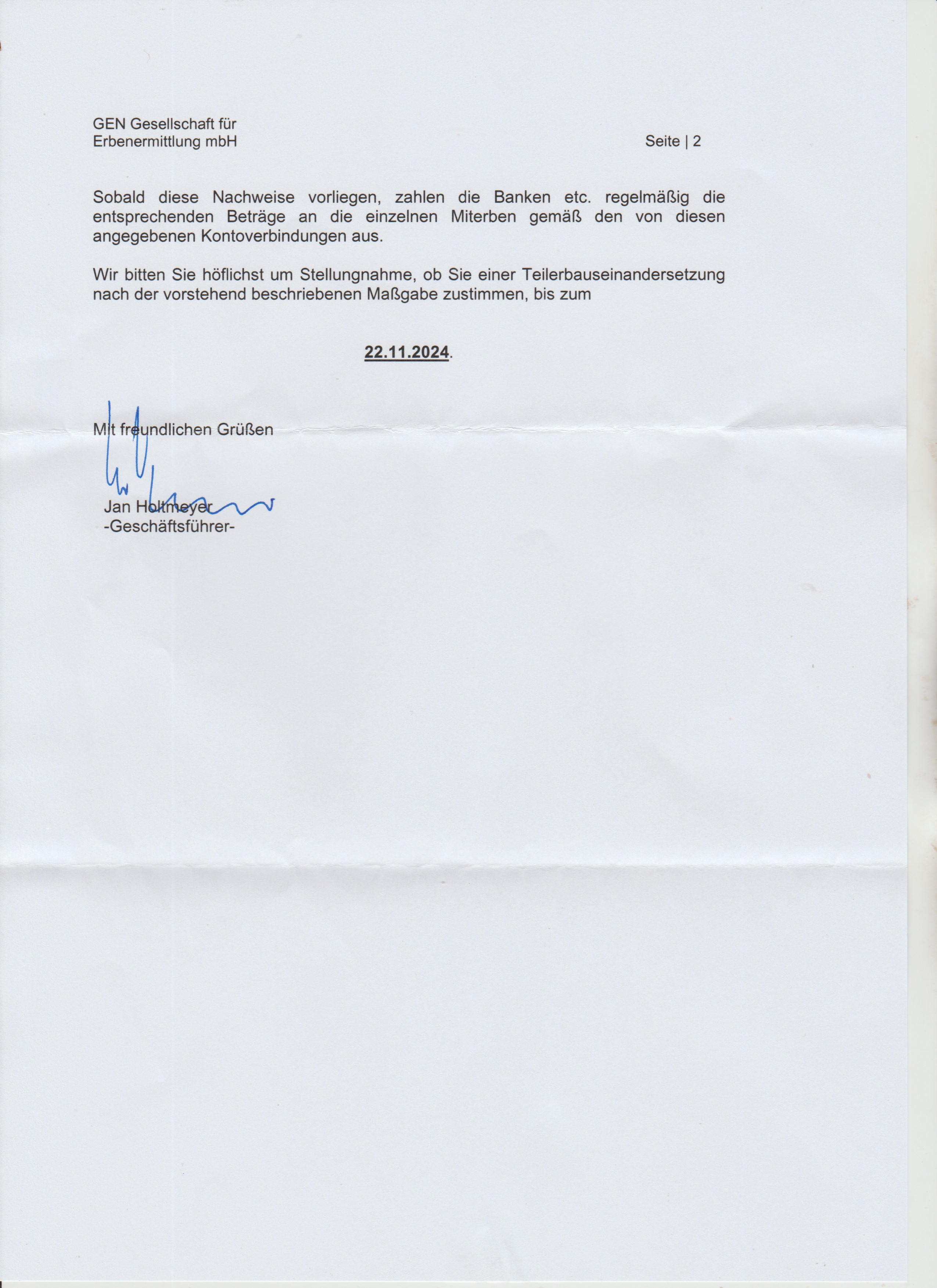 Die VOLLMACHT entwarf der 1. Geschäftsführer der GEN und verschickte die an alle 7 Erbberechtigte – wolte uner Erbe ergaunern, durch Korruption, Erpressung.