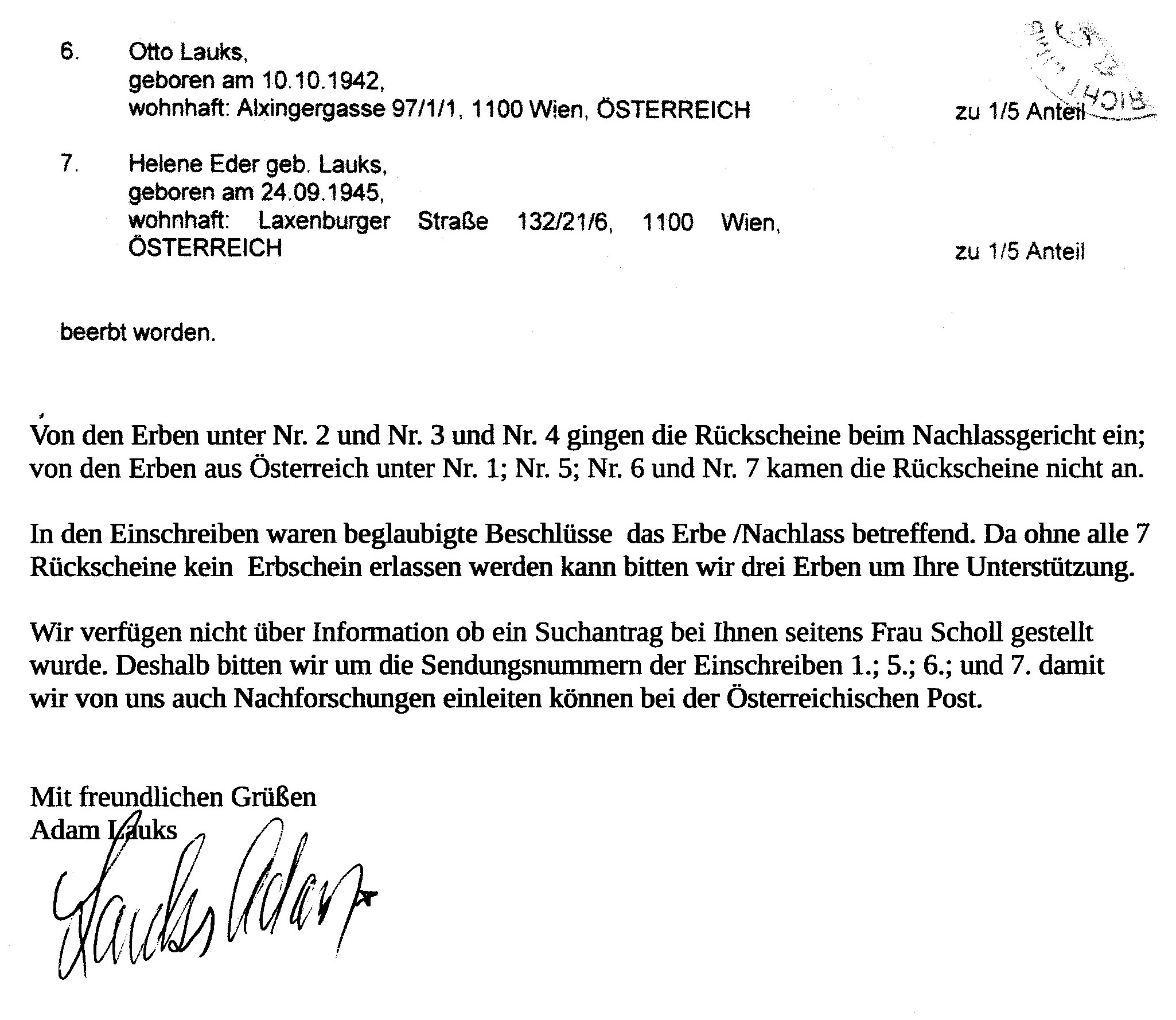 Aus dem Postbriefkasten an die Erbberechtigten – Miterben in Wien, weil die Briefe dorthin von einer unsichtbaren Macht oder Verräter unsere Tante Helene Lauks verheiratete Eder, Onkel Otto Lauks und Cousine Susanne Peter und der GEN loyale Elfriede Leitgeb auf dem Postwege, auch mit Rückschein oder E-Mail nachweislich nicht erreichen, muss es so sein.