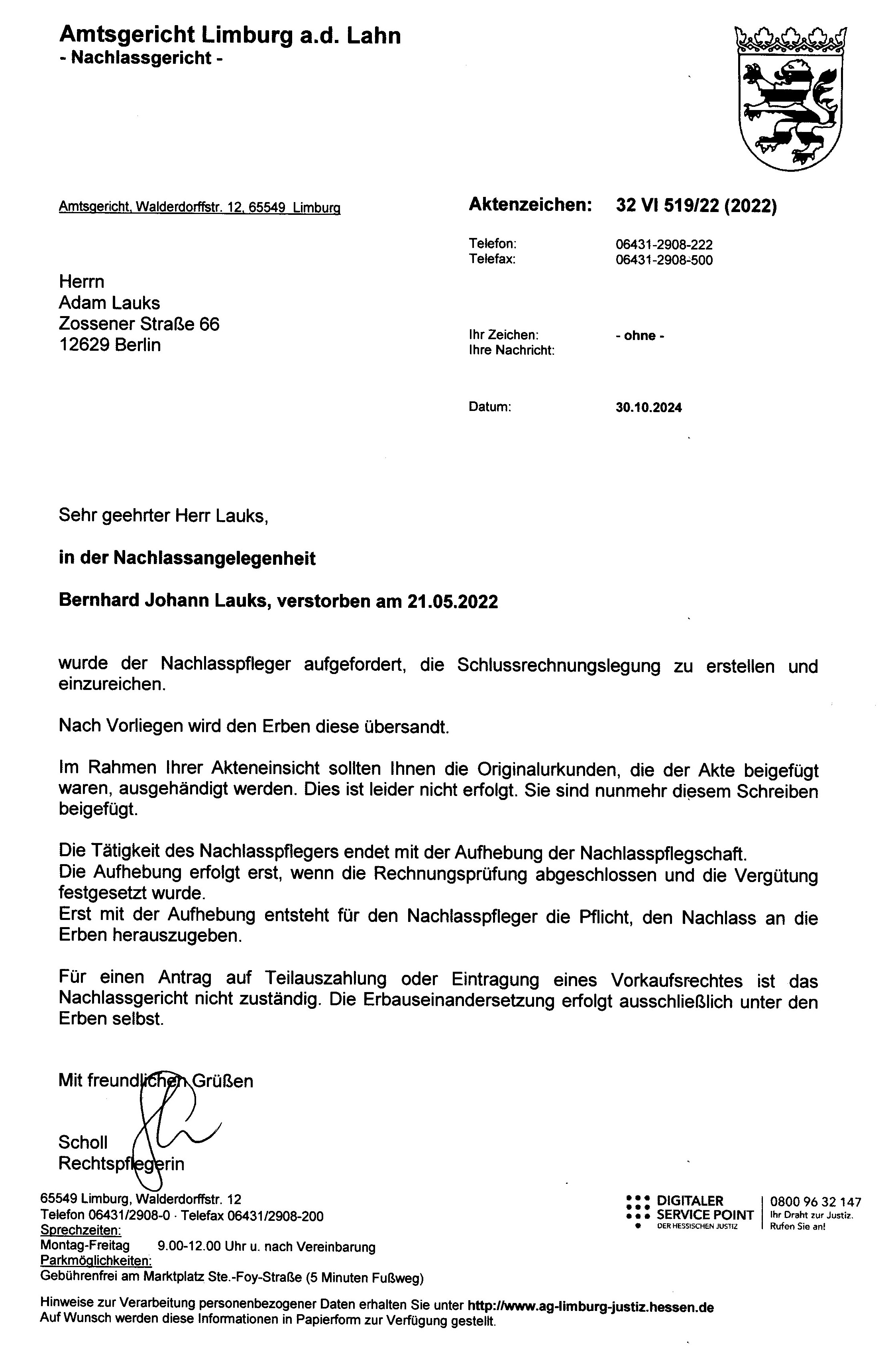 Blatt der Akte 226 25.04.2024 an den Direktor des Amtsgerichtes 32 VI 519/22 Bernhard Lauks AG Limburg a. d. Lahn