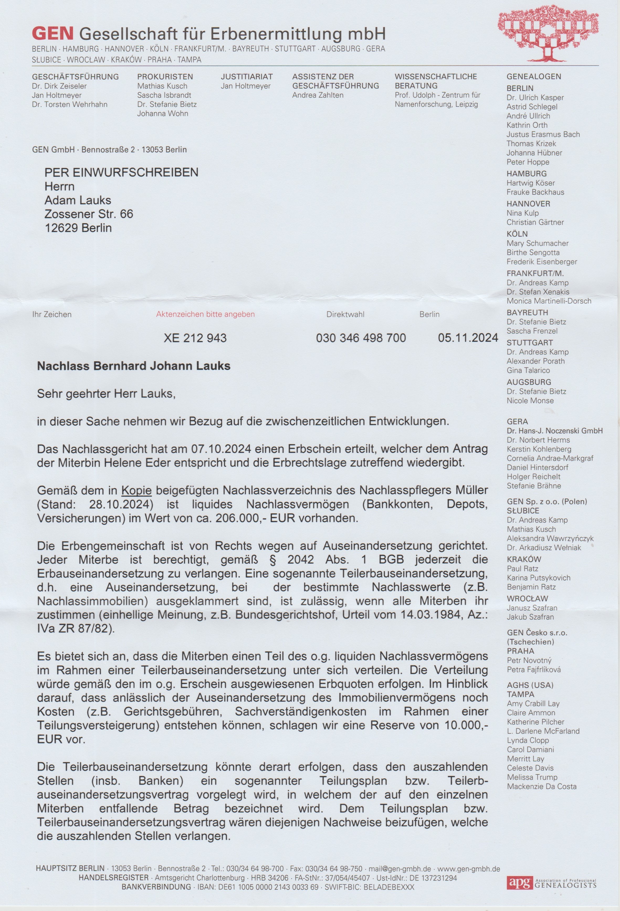 i.V. der Erbengemeinschaft nach Bernhard Johann Lauks Anlagen: