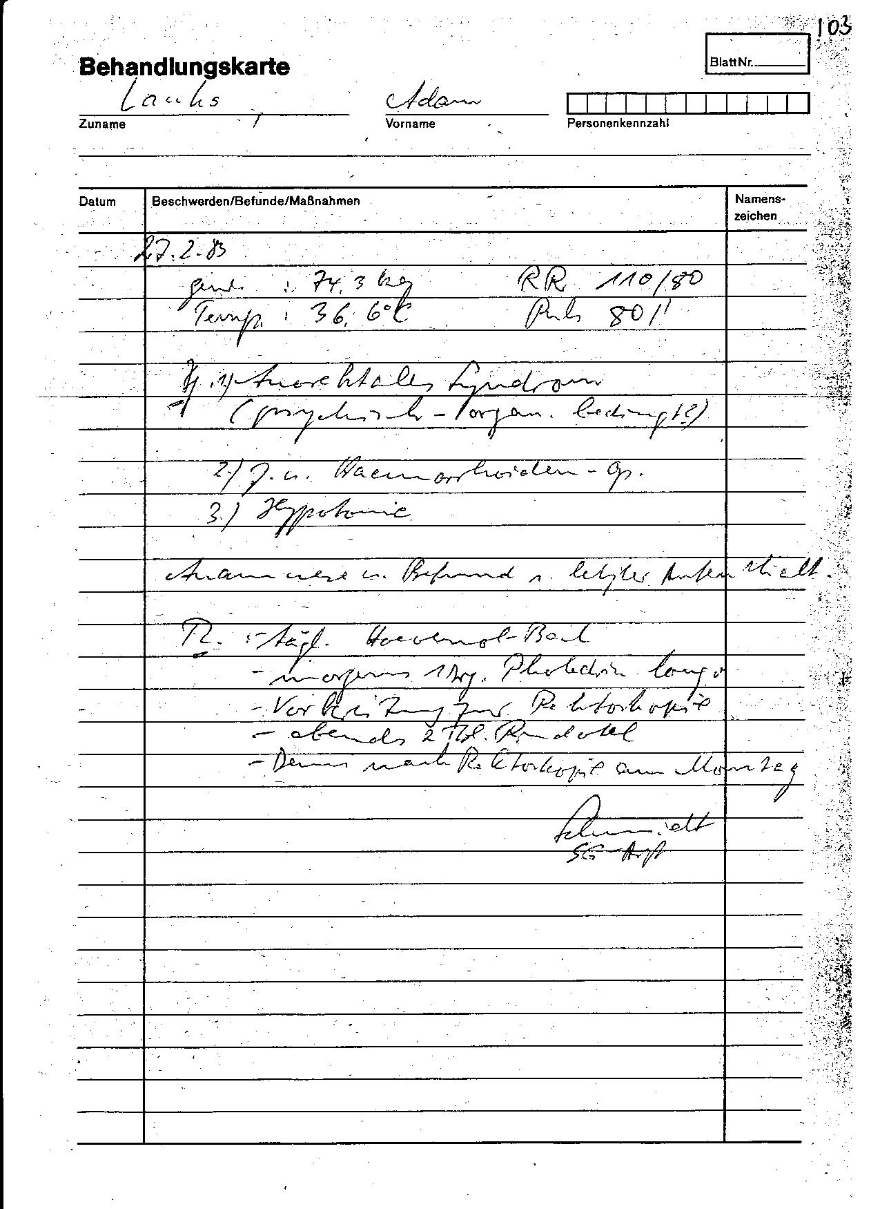 Schon die Ablage 27.2. nach den 28.2.83 abzulegen zeigt auf Fälschung,bzw Falschberichte und Falschdiagnosen. Es gab am 27.2.1983 keine Einlieferung ins Haus 8 und es gab KEINERLEI Vorbereitung was auf eine Rektoskopie hinweisen würde. Es gab auch keinen Befund nach der „Aufpfählung “ am 28.2.83.