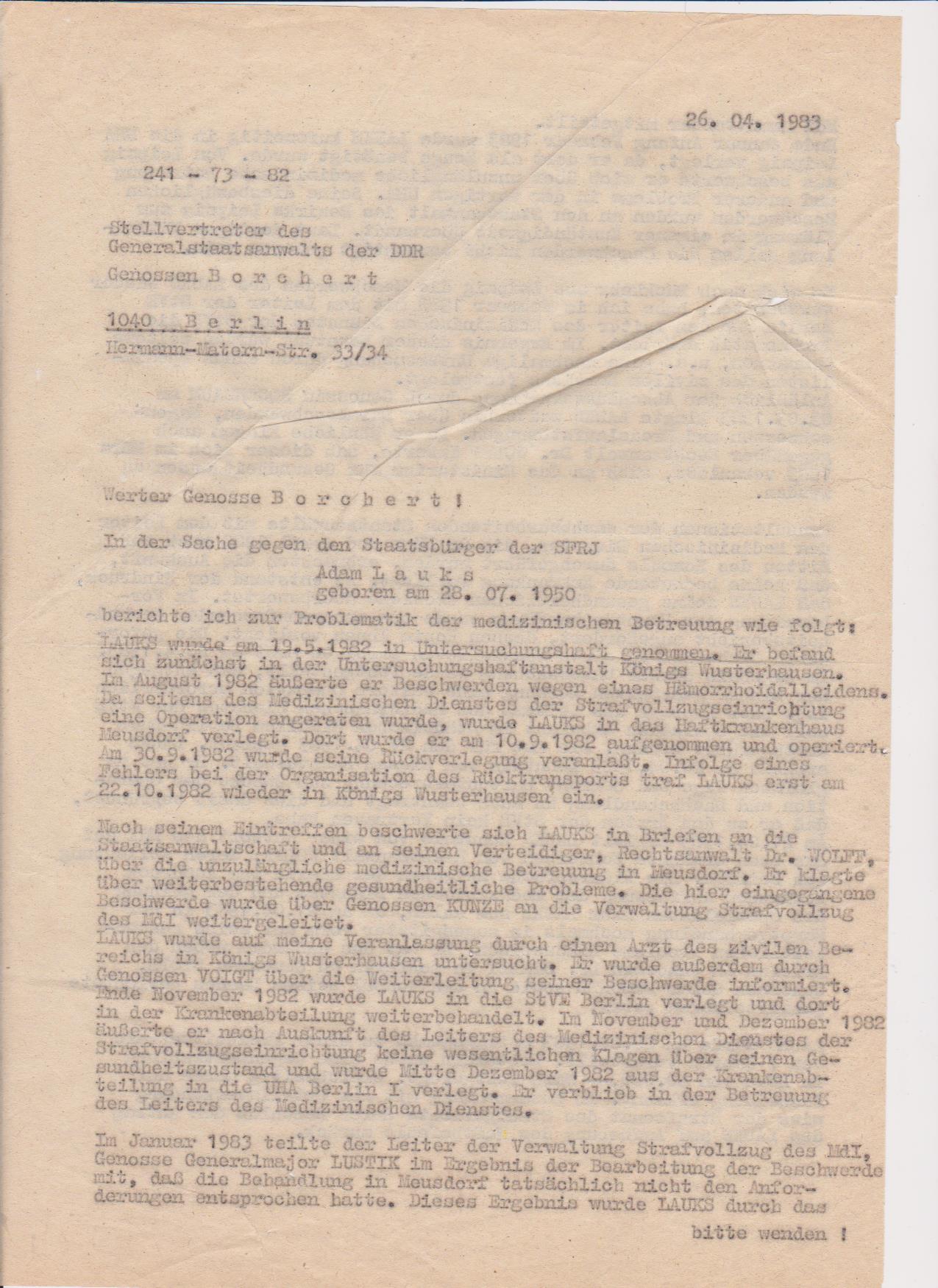 „Lauks wurde auf meine Veranlassung durcjh einen Arzt des zivilen Bereiches in Königswusterhausen untersucht.“ Dr. Beinarowitz lügt und blendet den höchstdenkbaren Besuch Generalmajor Prof. OMR Dr. Kelch und IME „Pit“ OSL Dr. Peter Janata völlig aus die den tatsächlichen Gesundheitzustand und Folgeschaden der vereitelten Nachbehandlung im Leipzig Meusdorf genau untersucht und festgestellt hatten. Die Untersuchung fand in Wildau und mißlang weil die Einführung des Stetoskopes nicht möglich war. Es ist erkennbar dass mibdestens dre oder vier IM autonom und konspirativ fungieren.