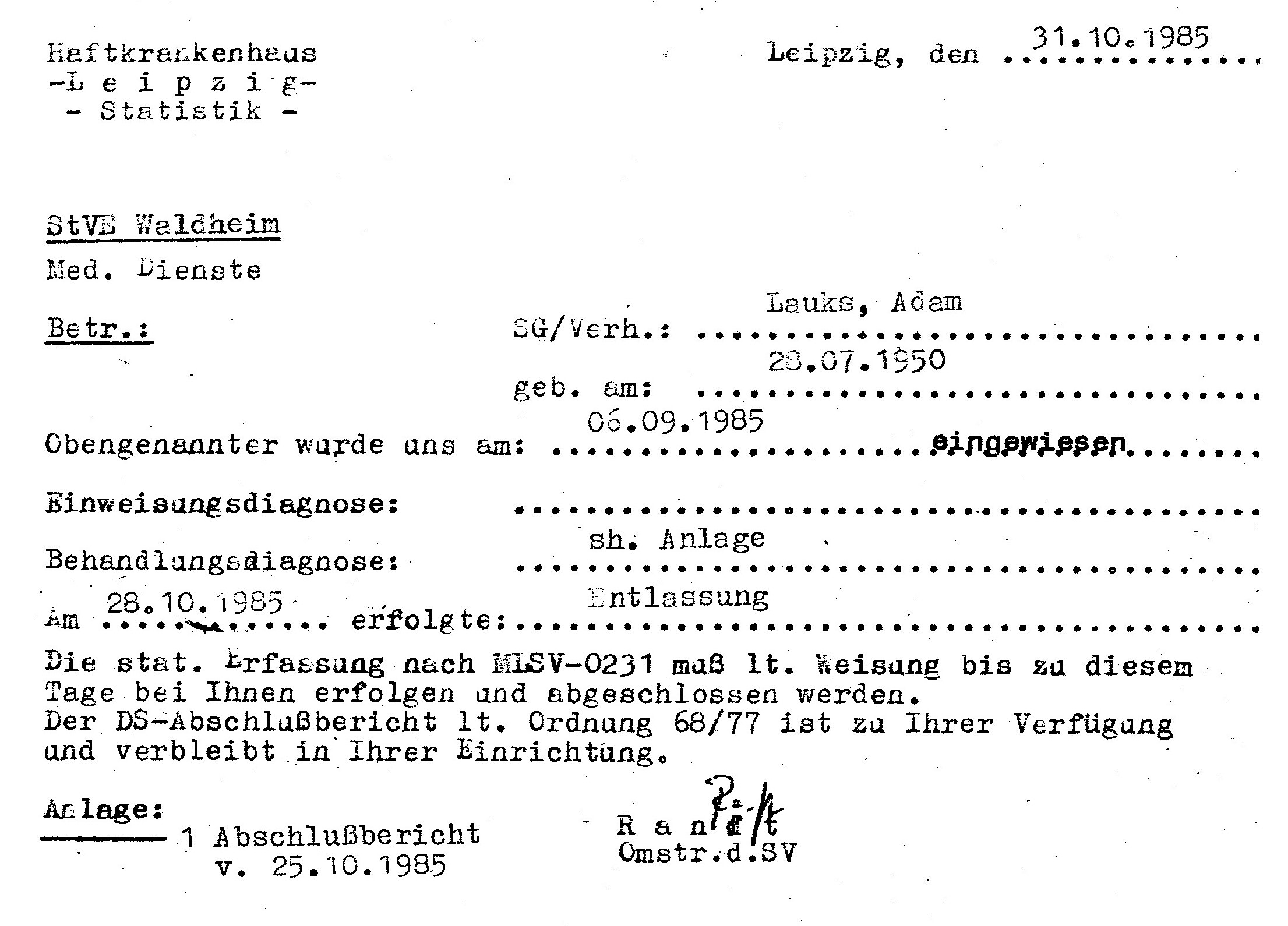 ← „lückenlose medizinische Betreuung nach gegebenen Weisungen und Befehlen des MfS“ wurde zum Operativ Vorgang gegen VH und später SG Adam Lauks alias Staatsfeind der DDR Nr. 1 „Merkur“ in: Berlin Rummelsburg; Leipzig Meusdorf; Dresden; Berlin Buch und Spezielle Strafvollzugsabteilung Waldheim.