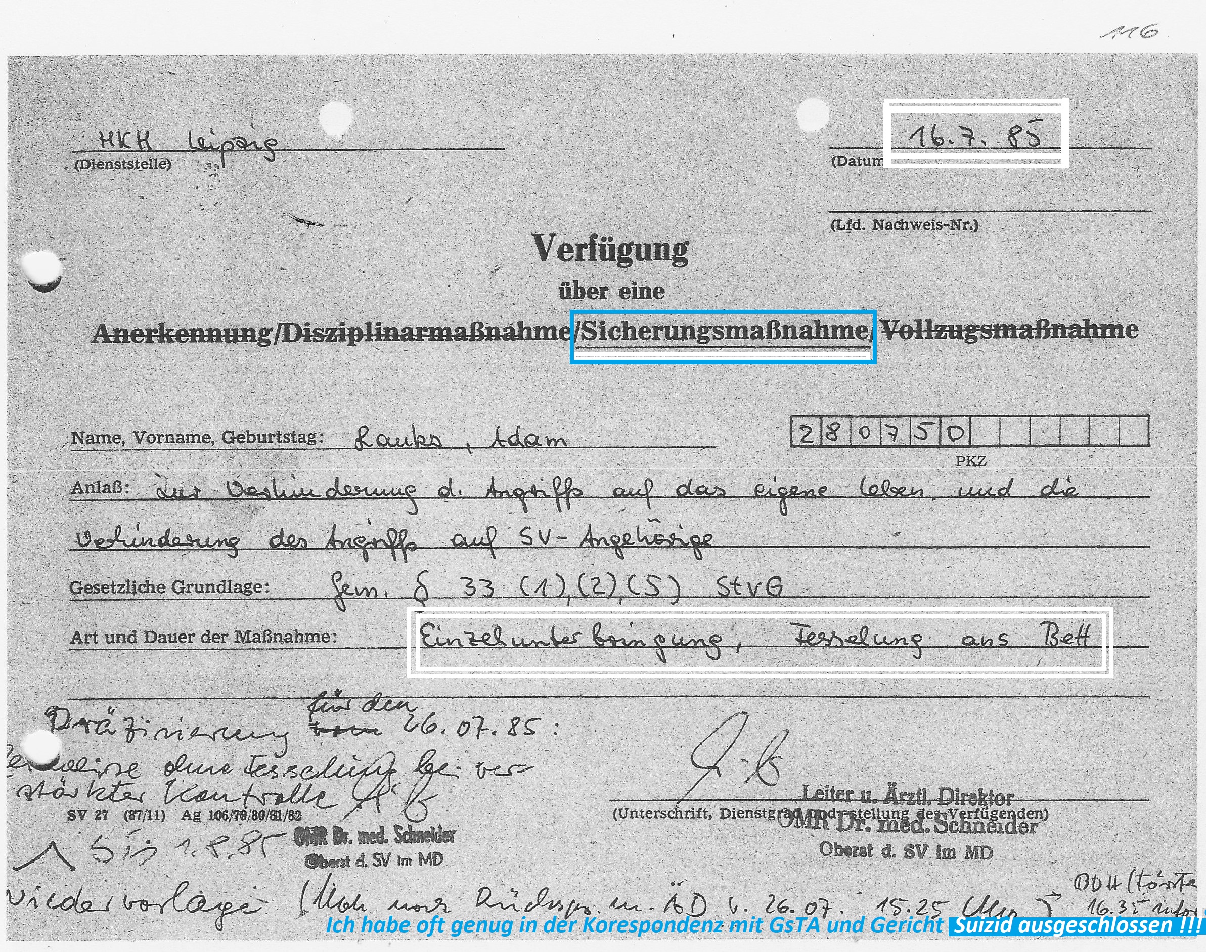 ← „lückenlose medizinische Betreuung nach gegebenen Weisungen und Befehlen des MfS“ wurde zum Operativ Vorgang gegen VH und später SG Adam Lauks alias Staatsfeind der DDR Nr. 1 „Merkur“ in: Berlin Rummelsburg; Leipzig Meusdorf; Dresden; Berlin Buch und Spezielle Strafvollzugsabteilung Waldheim.