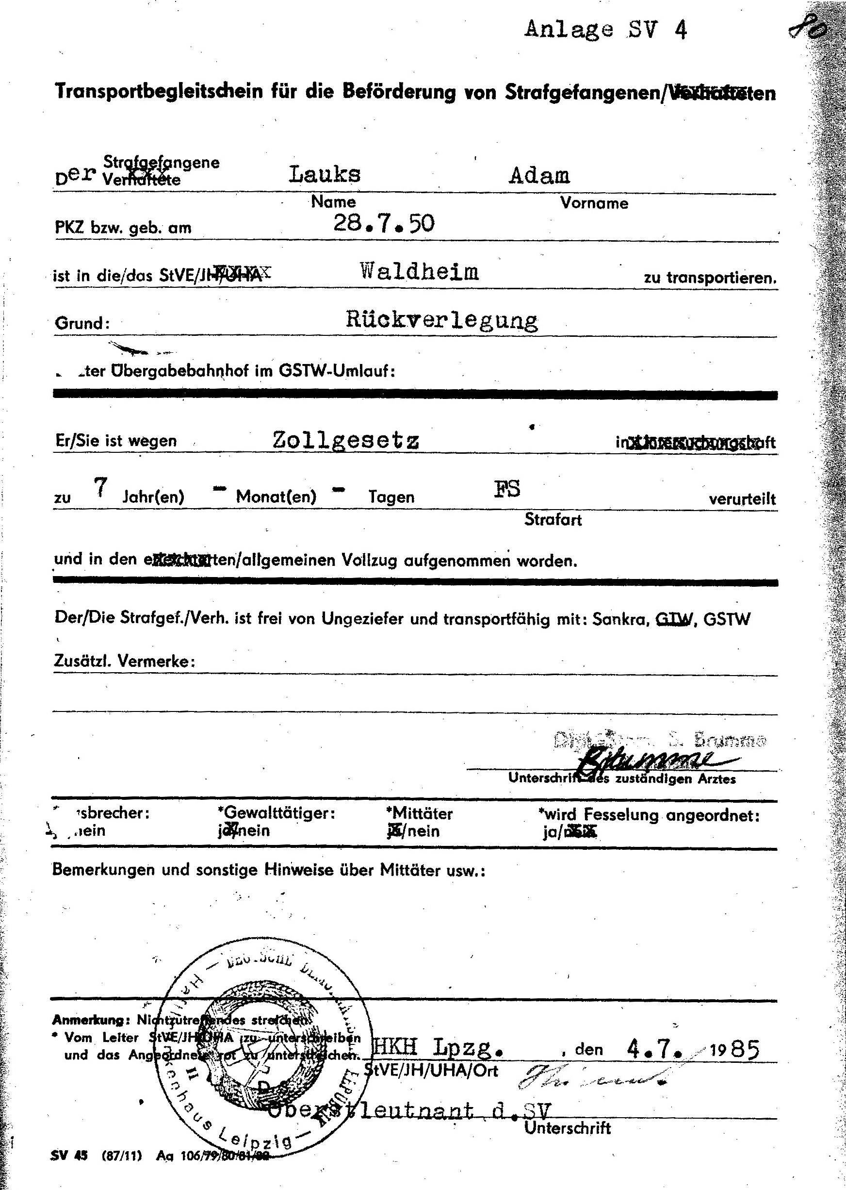 ← „lückenlose medizinische Betreuung nach gegebenen Weisungen und Befehlen des MfS“ wurde zum Operativ Vorgang gegen VH und später SG Adam Lauks alias Staatsfeind der DDR Nr. 1 „Merkur“ in: Berlin Rummelsburg; Leipzig Meusdorf; Dresden; Berlin Buch und Spezielle Strafvollzugsabteilung Waldheim.