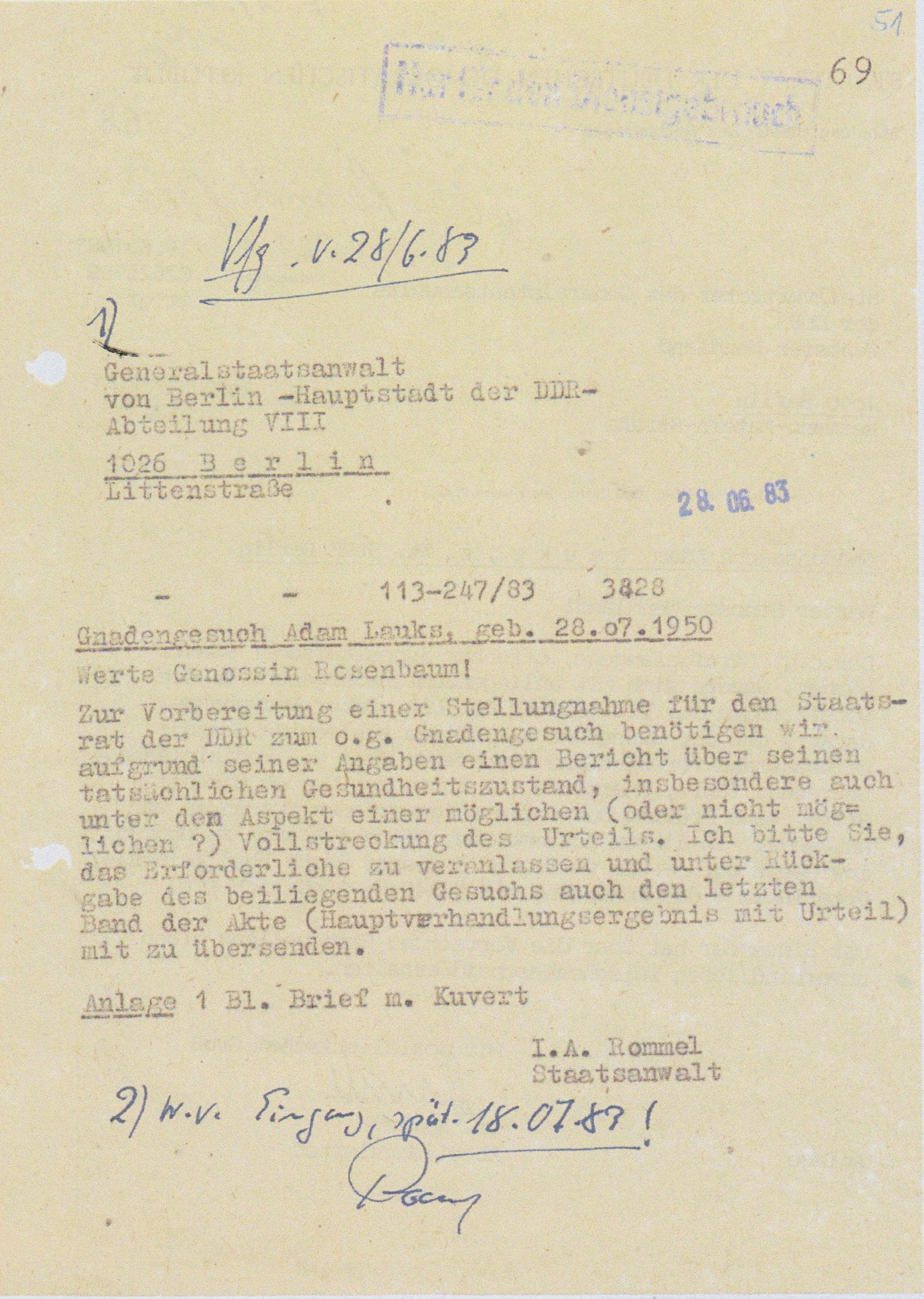 ← „lückenlose medizinische Betreuung nach gegebenen Weisungen und Befehlen des MfS“ wurde zum Operativ Vorgang gegen VH und später SG Adam Lauks alias Staatsfeind der DDR Nr. 1 „Merkur“ in: Berlin Rummelsburg; Leipzig Meusdorf; Dresden; Berlin Buch und Spezielle Strafvollzugsabteilung Waldheim.