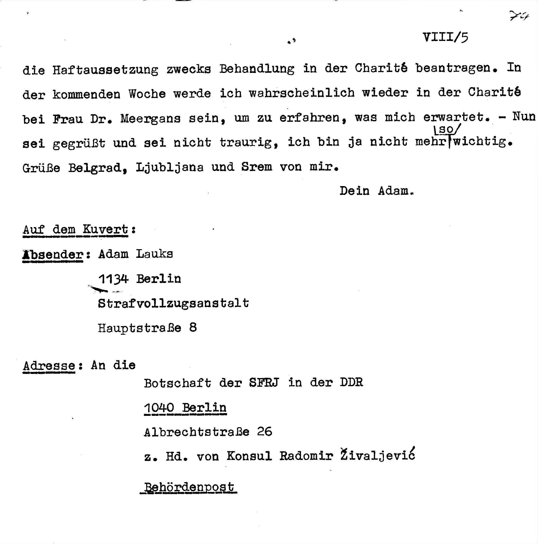 ← „lückenlose medizinische Betreuung nach gegebenen Weisungen und Befehlen des MfS“ wurde zum Operativ Vorgang gegen VH und später SG Adam Lauks alias Staatsfeind der DDR Nr. 1 „Merkur“ in: Berlin Rummelsburg; Leipzig Meusdorf; Dresden; Berlin Buch und Spezielle Strafvollzugsabteilung Waldheim.