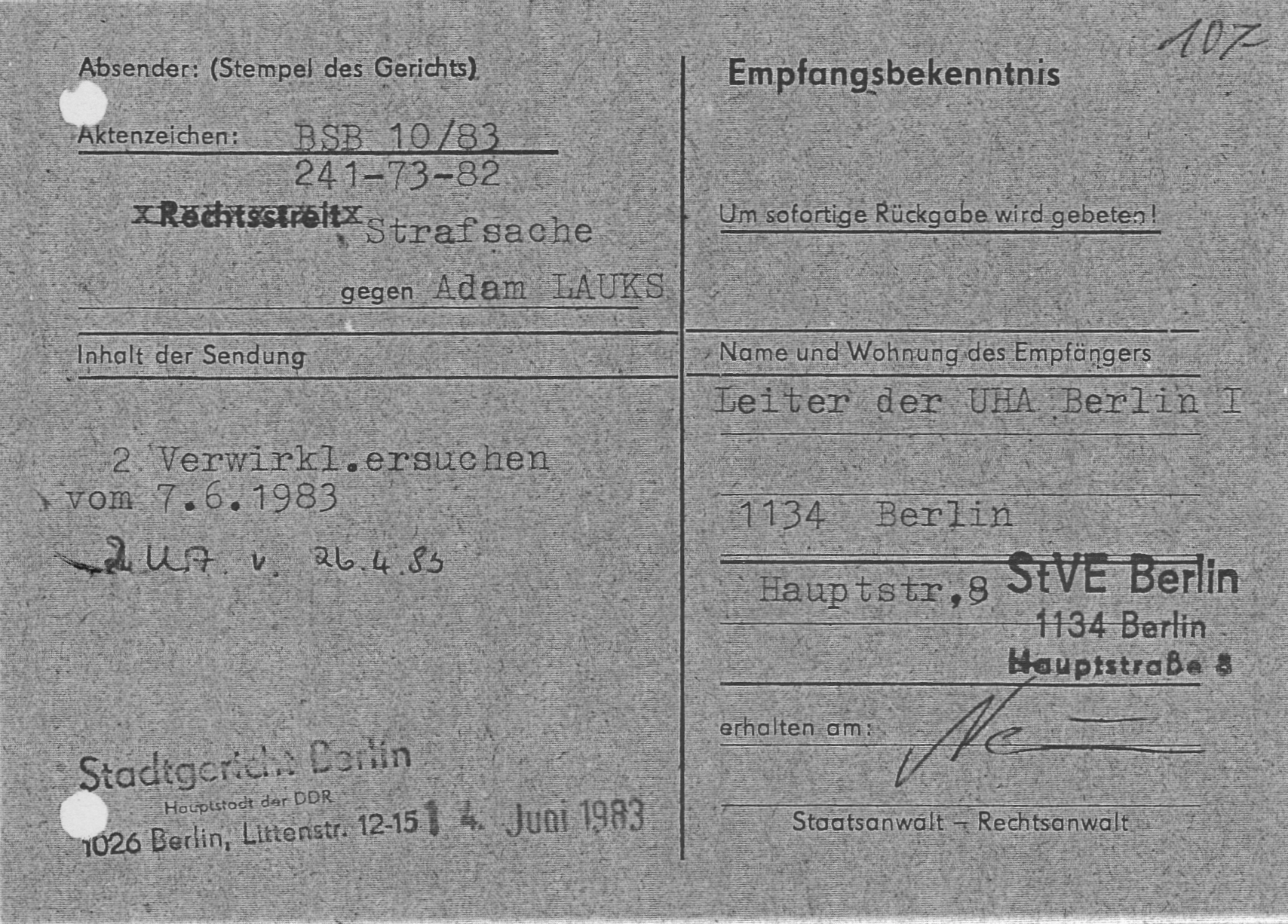 ← „lückenlose medizinische Betreuung nach gegebenen Weisungen und Befehlen des MfS“ wurde zum Operativ Vorgang gegen VH und später SG Adam Lauks alias Staatsfeind der DDR Nr. 1 „Merkur“ in: Berlin Rummelsburg; Leipzig Meusdorf; Dresden; Berlin Buch und Spezielle Strafvollzugsabteilung Waldheim.