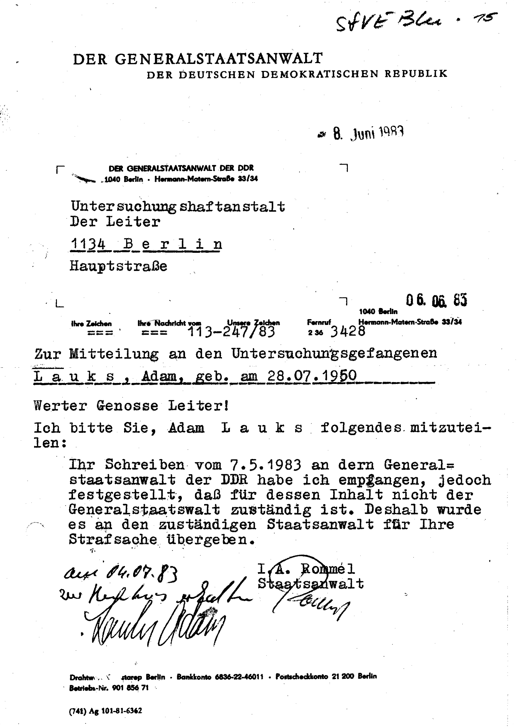 ← „lückenlose medizinische Betreuung nach gegebenen Weisungen und Befehlen des MfS“ wurde zum Operativ Vorgang gegen VH und später SG Adam Lauks alias Staatsfeind der DDR Nr. 1 „Merkur“ in: Berlin Rummelsburg; Leipzig Meusdorf; Dresden; Berlin Buch und Spezielle Strafvollzugsabteilung Waldheim.