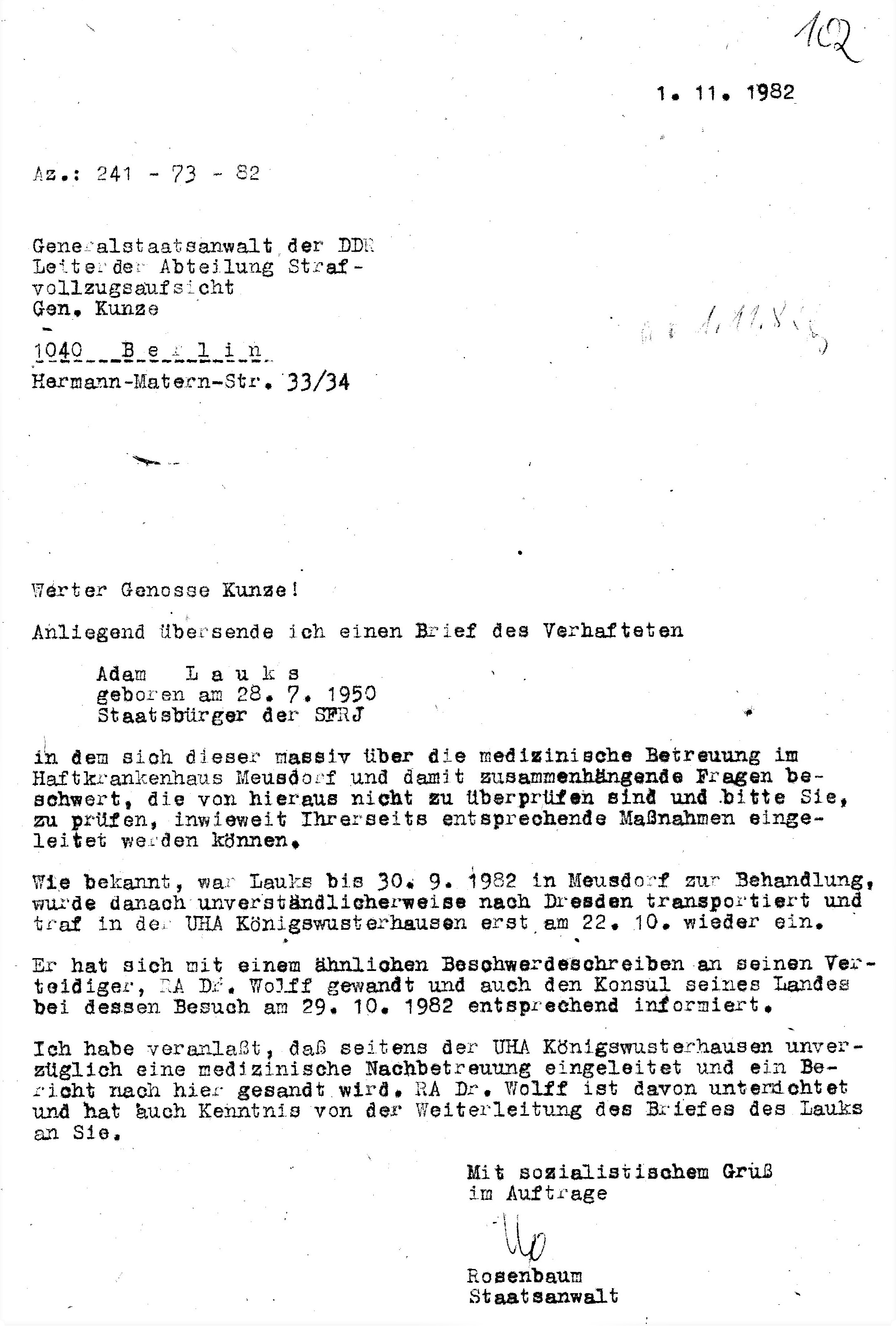← „lückenlose medizinische Betreuung nach gegebenen Weisungen und Befehlen des MfS“ wurde zum Operativ Vorgang gegen VH und später SG Adam Lauks alias Staatsfeind der DDR Nr. 1 „Merkur“ in: Berlin Rummelsburg; Leipzig Meusdorf; Dresden; Berlin Buch und Spezielle Strafvollzugsabteilung Waldheim.