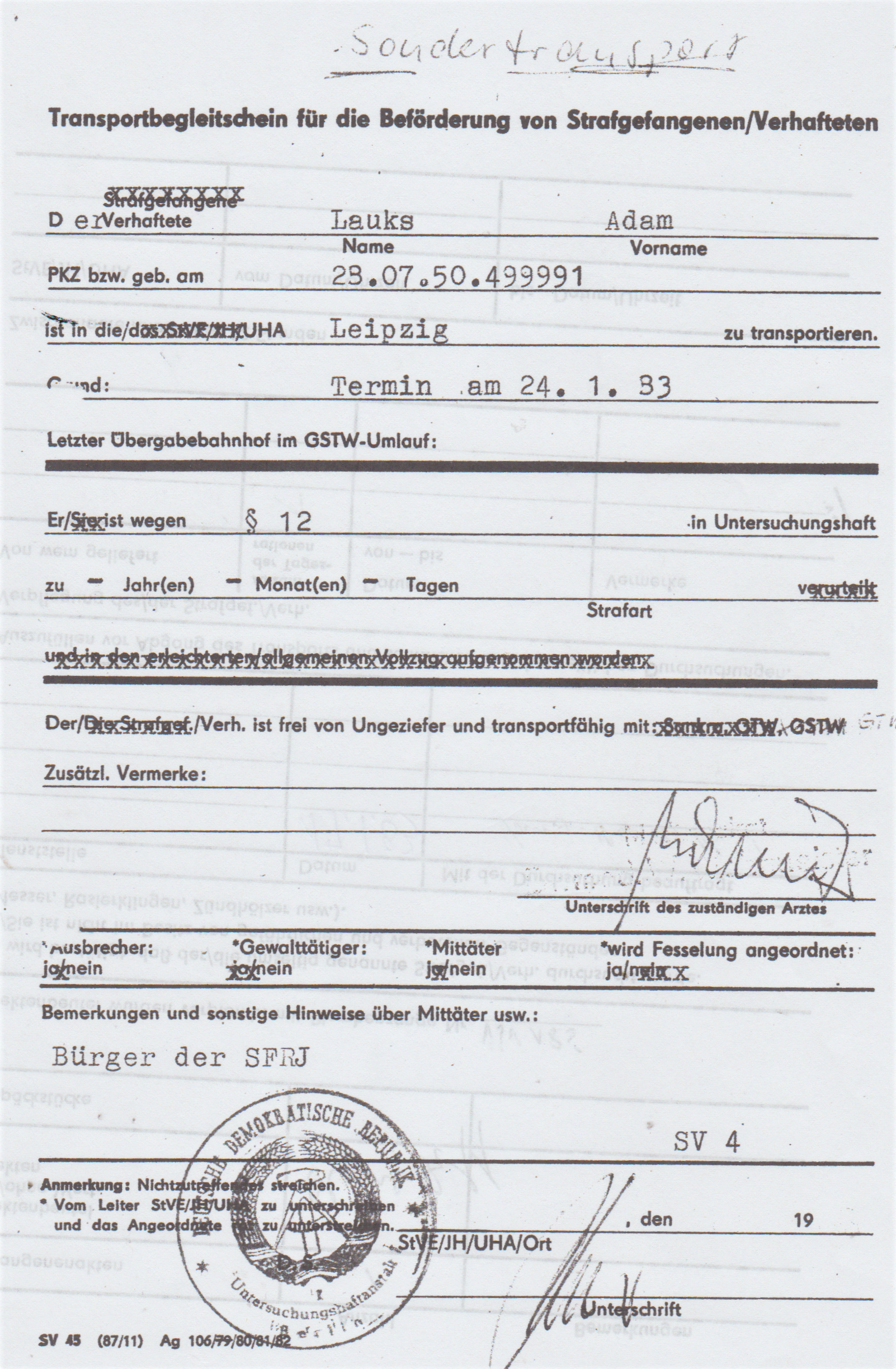 ← „lückenlose medizinische Betreuung nach gegebenen Weisungen und Befehlen des MfS“ wurde zum Operativ Vorgang gegen VH und später SG Adam Lauks alias Staatsfeind der DDR Nr. 1 „Merkur“ in: Berlin Rummelsburg; Leipzig Meusdorf; Dresden; Berlin Buch und Spezielle Strafvollzugsabteilung Waldheim.