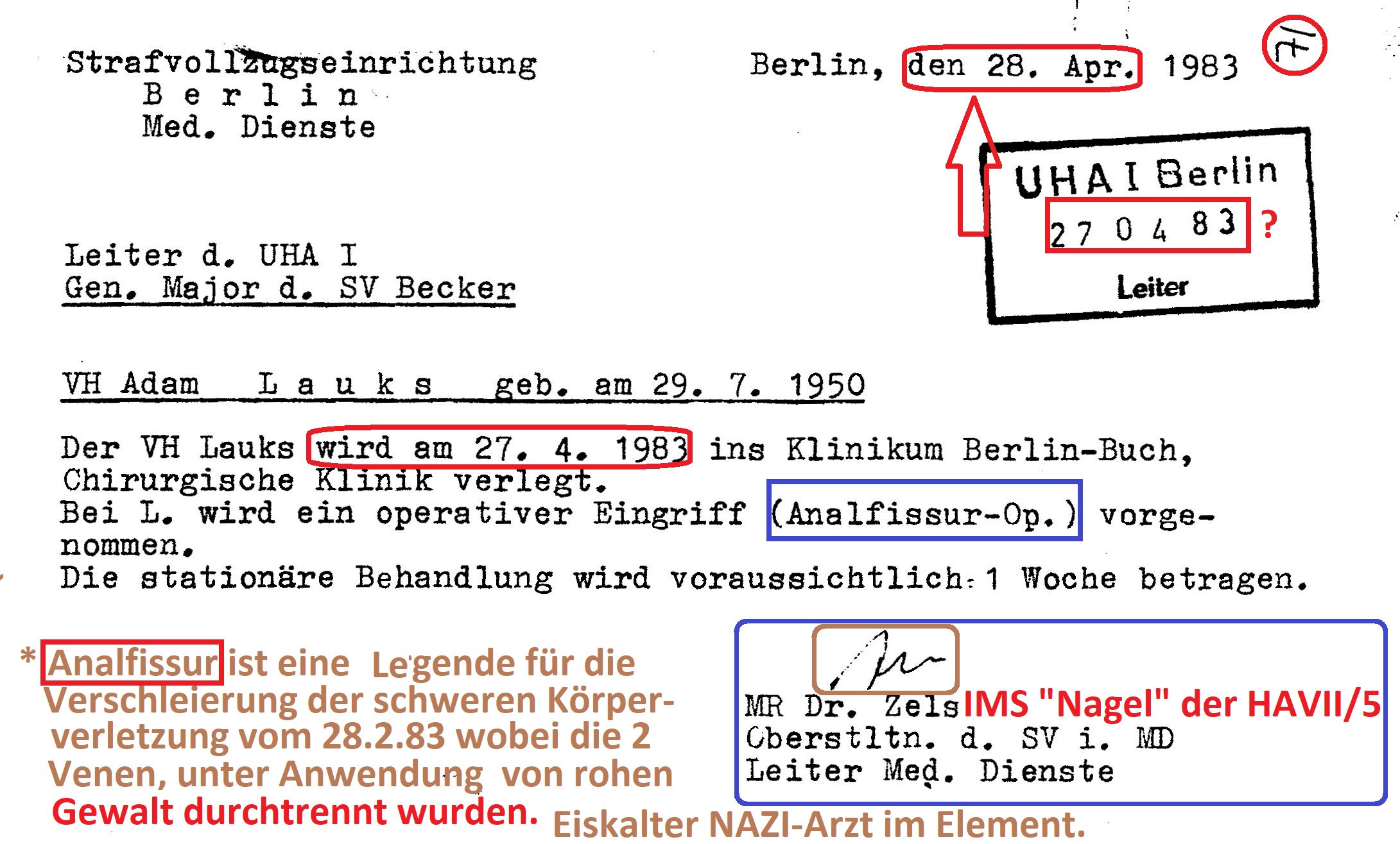 ← „lückenlose medizinische Betreuung nach gegebenen Weisungen und Befehlen des MfS“ wurde zum Operativ Vorgang gegen VH und später SG Adam Lauks alias Staatsfeind der DDR Nr. 1 „Merkur“ in: Berlin Rummelsburg; Leipzig Meusdorf; Dresden; Berlin Buch und Spezielle Strafvollzugsabteilung Waldheim.