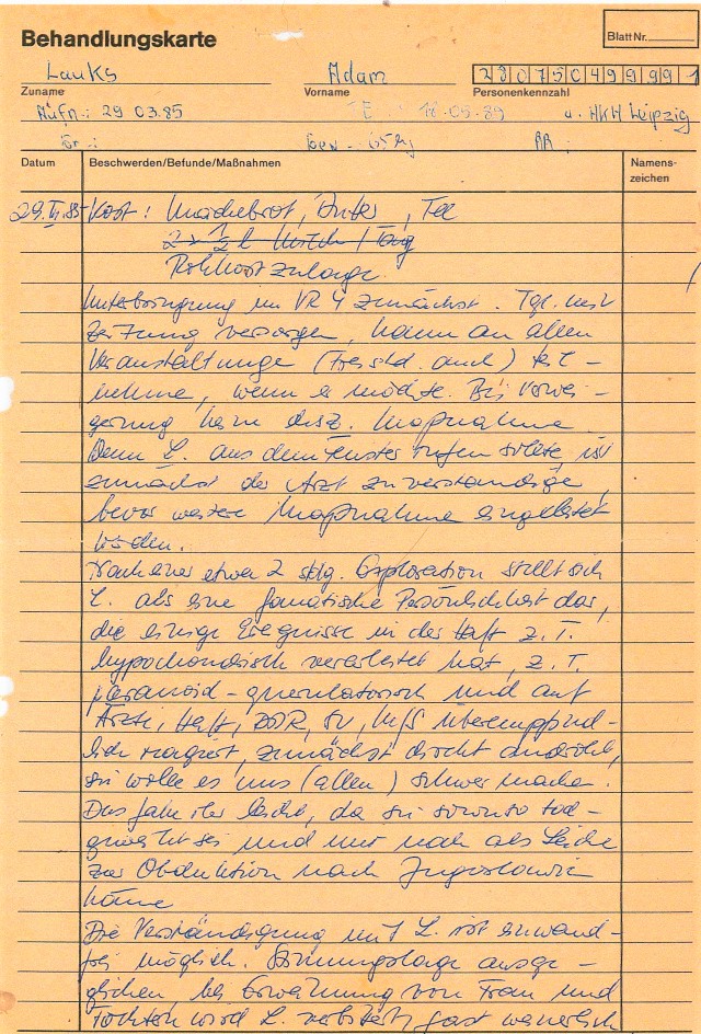 ← „lückenlose medizinische Betreuung nach gegebenen Weisungen und Befehlen des MfS“ wurde zum Operativ Vorgang gegen VH und später SG Adam Lauks alias Staatsfeind der DDR Nr. 1 „Merkur“ in: Berlin Rummelsburg; Leipzig Meusdorf; Dresden; Berlin Buch und Spezielle Strafvollzugsabteilung Waldheim.