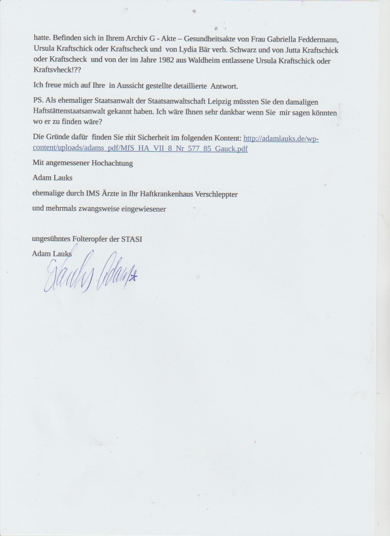 200 AR 1287/15 StA Chemnitz und 24 Zs 507/16 GenStA Dresden – „Vorermittlungen“ seit Februar 2015 !?- wurden durch den OStA Vogel erst am 2.12.2016 eingestellt!?? Er darf und wird nicht weiter ermitteln, wegen Mord ?!? – Findet das Grab von Ursula Krafczyk alias Jurek Krafczyk aus Glindow ! In der Arrestzelle „18“ in der Speziellen Strafvollzugsabteilung Waldheim 1984/85 war die Endstation für Republikflüchtling Ursula. Das Verschwinden des Zugangs- und Abgangsbuches ist eine starke Indiz für den Mord am 24.6.1984! Da man das einzig wahre Beweismittel so sorgfältig verschwinden liess ( HA VII/8 und HA VII/5 alias K-1 waren maßgäblich an der Vertuschung der Vorkommnisse beteiligt. Die HA VII/8 wurde oder die K-1 des MdI wurde komplett per Weisung übernommen. WO IST DAS ZUGANGS-und ABGANGSBUCH VON STVE WALDHEIM ?!?