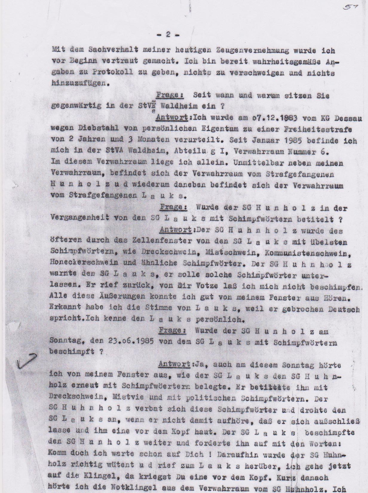 Er war der Zellennachbar von dem STASI-Schergen und Ohrenzeuge des Geschehens am Nachmittag 23.6.1985 in der „4“ der Speziellen Strafvollzugsabteilung von Waldheim – Kuckucksnest war Endstation in der Entstation Waldheim.