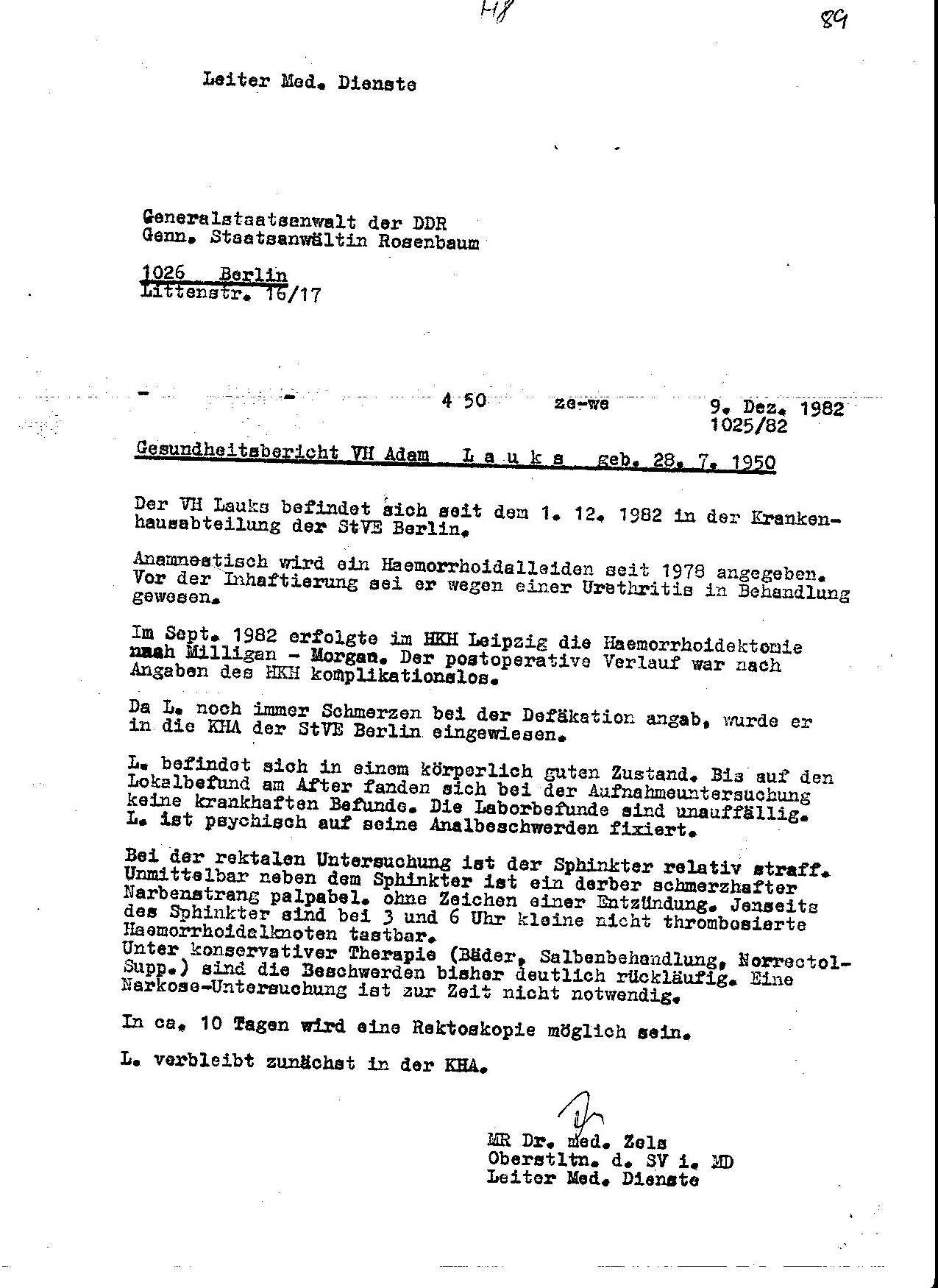 MR und Oberstleutnant Dr. Zels durfte Mielke behandeln und begutachten und beherbergte im Haus 8 von Rummelsburg Erich Honecker