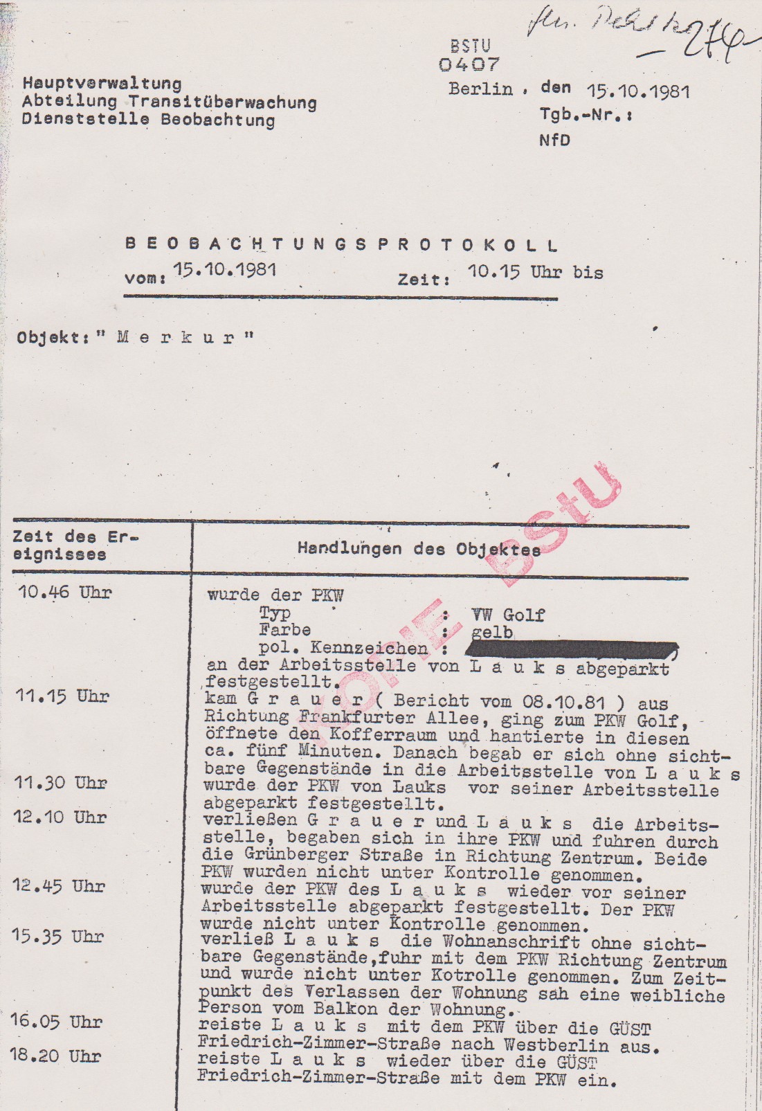 kam „Grauer“ aus Richtung Frankfurterallee, ging zum PKV Golg. öffnete den Kofferraum und hantierte in diesen ca. fünf Minuten.Danach begab ersich ohne sichtbare Gegenstände in die Arbeitsstelle von Lauks.
