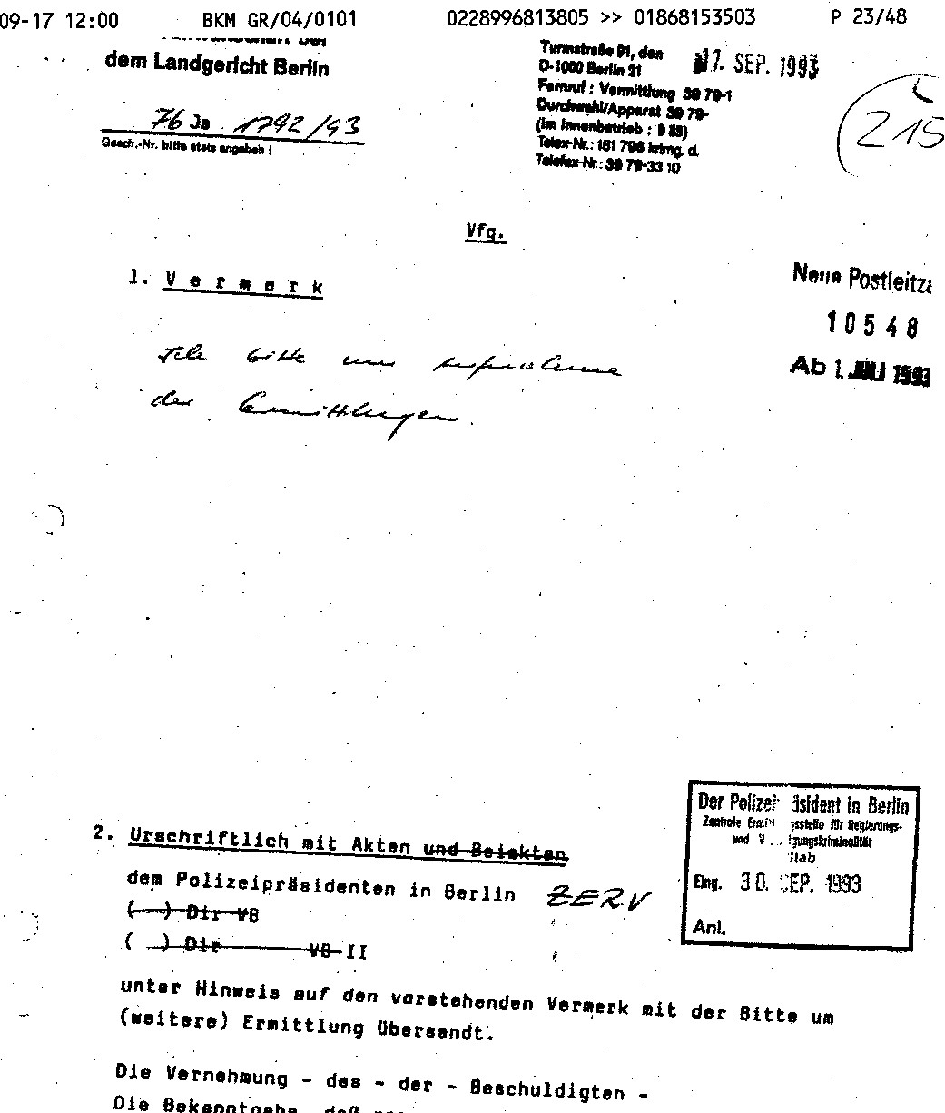 Ich bizze um die Aufnahme der Ermittlungen bei der ZERV des Polizeipräsidenten in Berlin eingegangen am 30.September 1993-Oberstaatsanwalt Trottmann