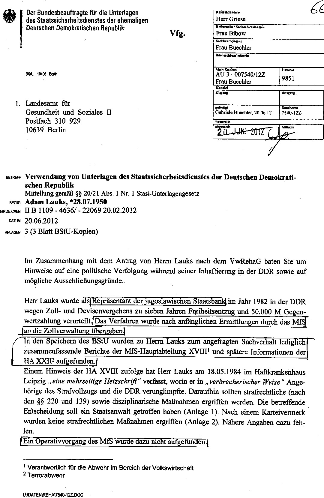 Mitteilung der BStU gemäß §§ 20/21 Abs.! Nr.1 StUG ist absicht manipuliert und inhaltlich und recherchemäßig falsch und tendentiös auf die Verhinderung der Verwaltungsrechtlichen und strafrechtlichen Rehabilitierung. Der Operativ Vorgang MERKUR wurde hauptsächtlich auf das Objekt MERKUR gerichtet seit 15.9.1981 und Objekt MERKUR bin ich Adam Lauks – ungesühntes Folteropfer des MfS