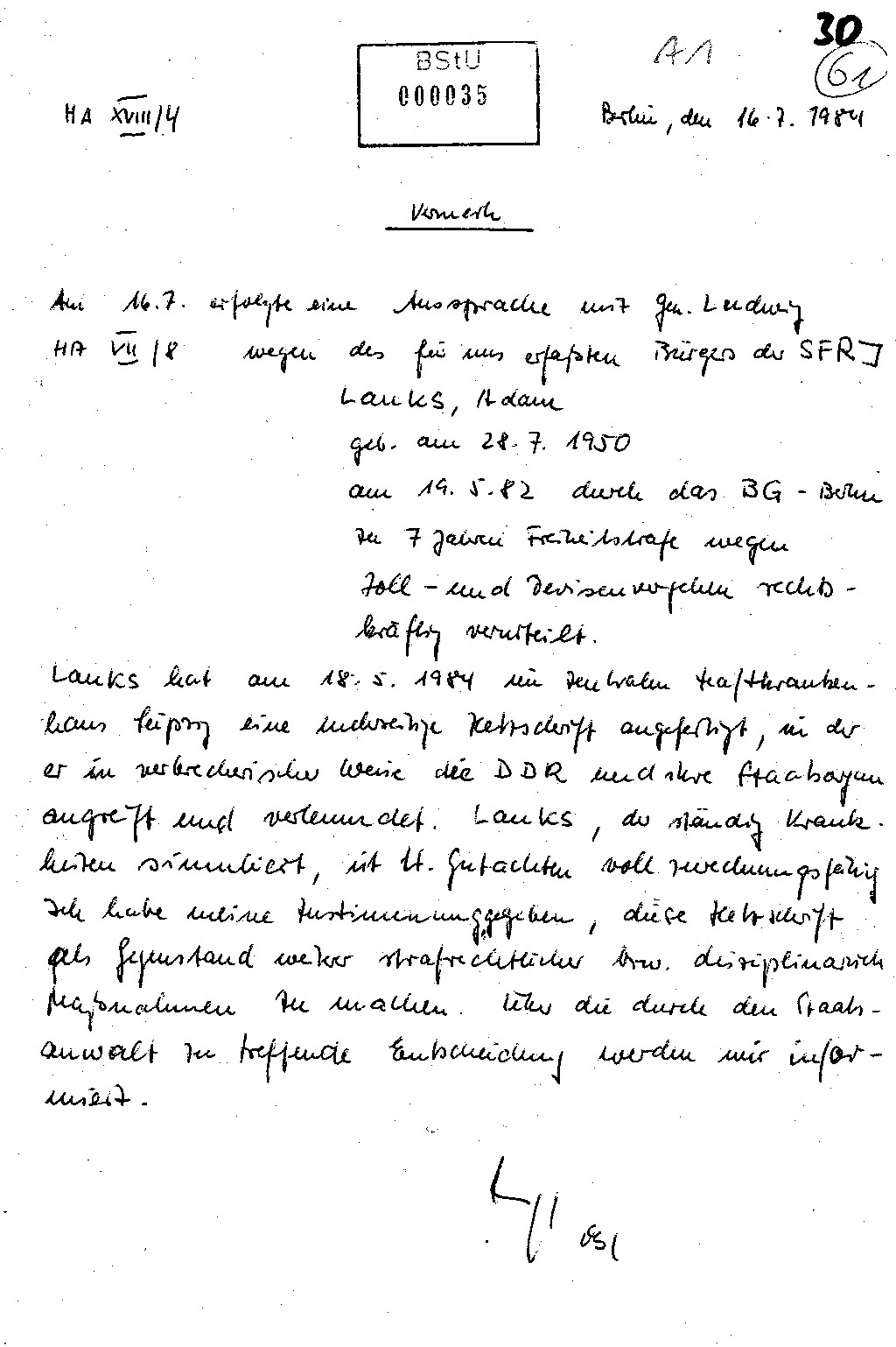Hier ist das Dokument – ein Vermerk vom 16.7.1984 der HA XVIII/4 mit der die STASI der Jahns Behörde Verdacht der Operativen Erfassung von MERKUR unsichtbar machen und Verdacht auf Folter,Mißhandlungen, Unterkieferbrich und Übergrieffe der IM Ärzte niederschlagen und den Antrag des RA Lerche verwaltungsrechtlich unrehabilitierbar machen !