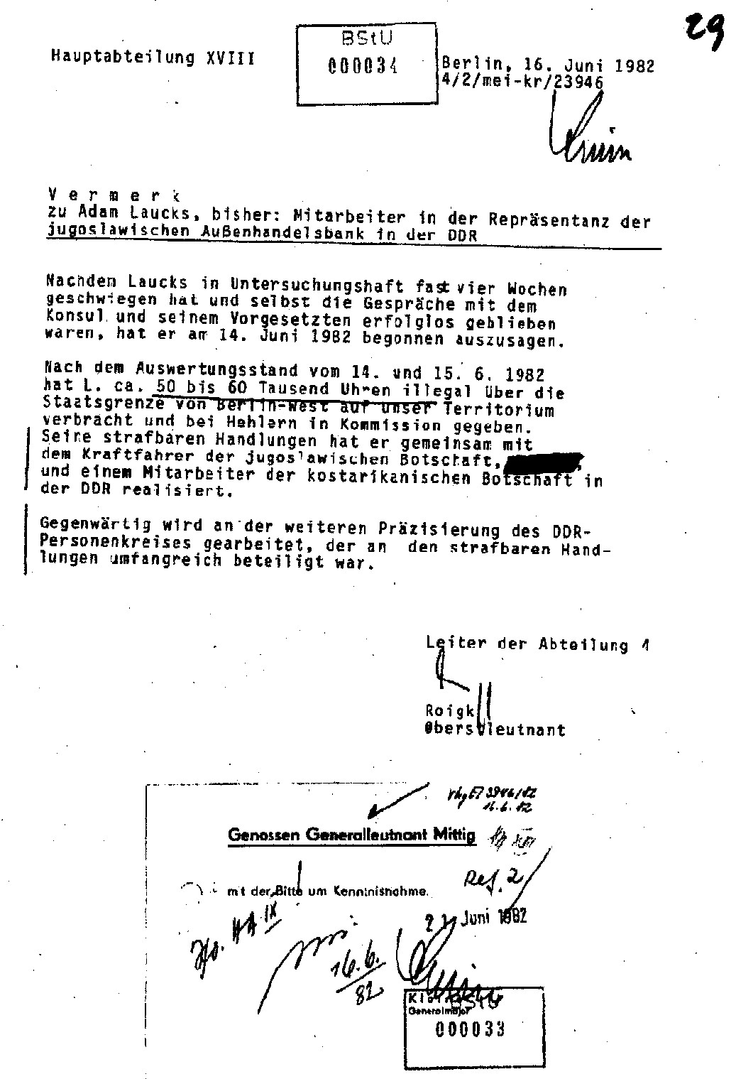 Ich habe keine einzige Uhr über die DDR Grenze je verbracht. Die Erfolgsmeldung ist also komplette Lüge. AnGeneralleutnant Mittig abgegeben landete die bei Mielke Wolf-Großmann !?