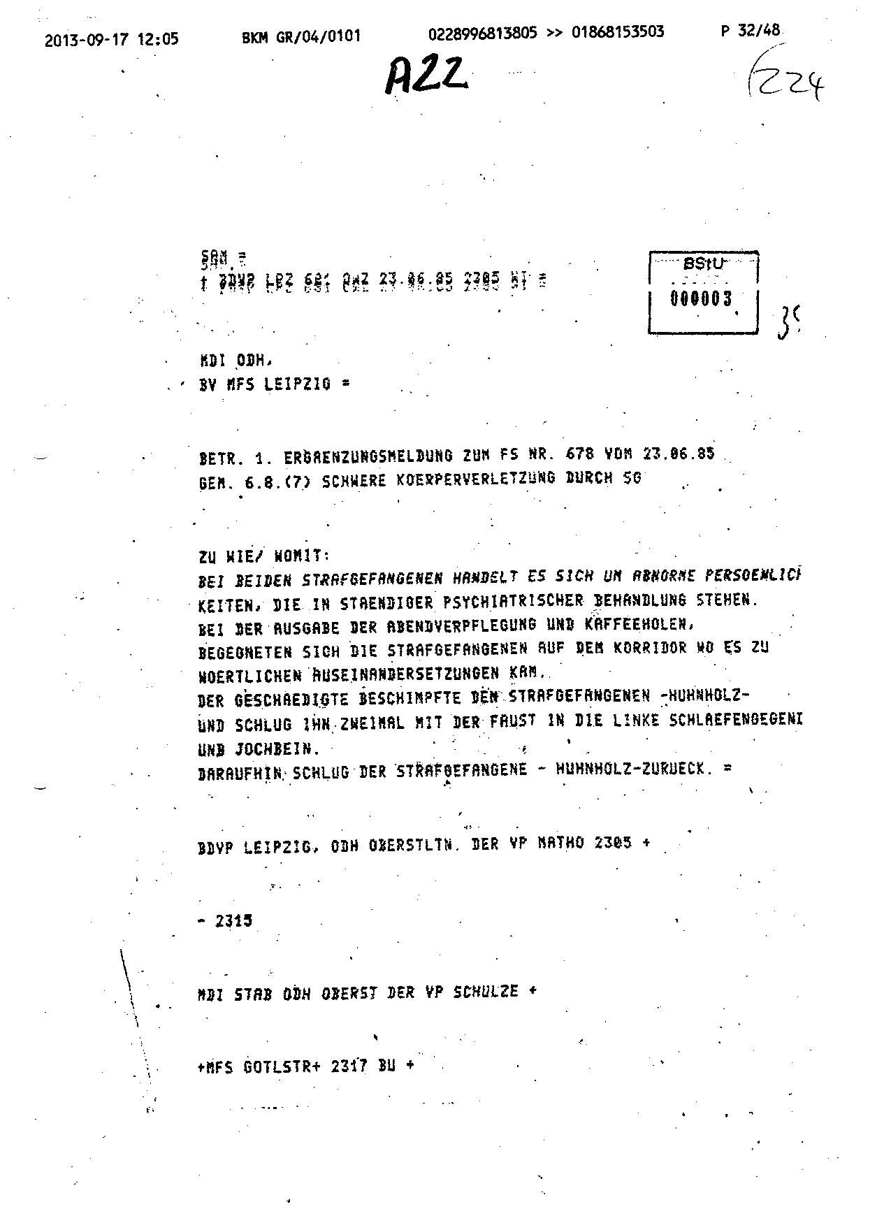 Diese Ergänzungsmeldung wird abgesetzt um 23.05 und da völlig falsch die STASI und den Täter schützen sooll. Was die STASI nicht weiß oder hat – und womöglich in den zwei fehlenden Bänder des OV“Merkur“ – MfS AO P3107/83 Band 9 und 10 oder in der AU 3455/83 Band 3 stecken könnte ist Vernehmungsprotokoll des Zellennachbar als Zeugen.