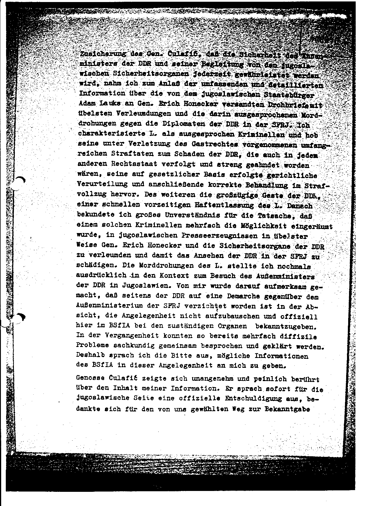 “Erich Honecker und Sicherheitsorgane der DDR zu verleumden und damit das Ansehen der DDR in der SFRJ zu schädigen. Die Morddrohungen des L. stellte ich nochmals ausdrücklich in den Kontext zum Besuch des Außenministers der DDR in Jugoslawien.”