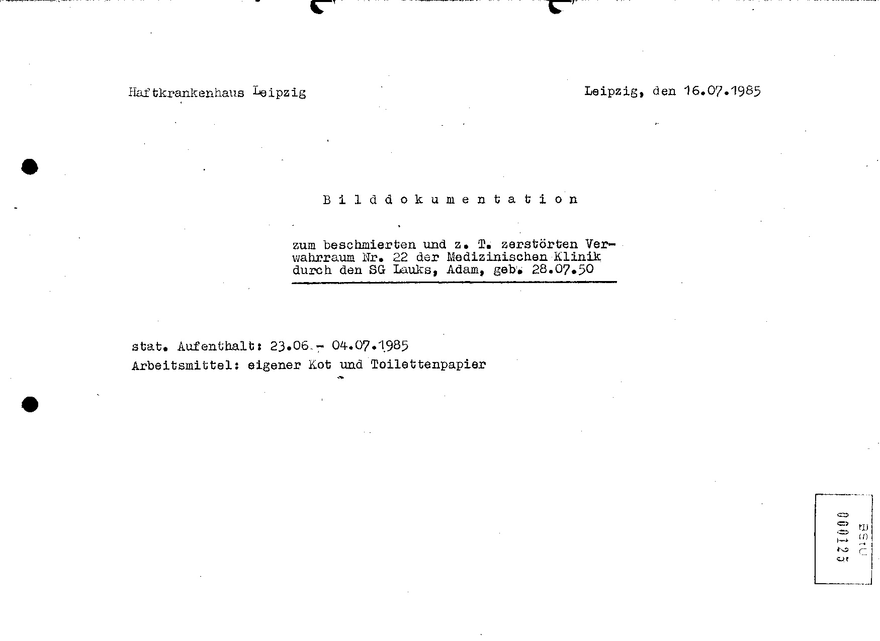 Meine Krankenzelle – “Ausländersuite” im Haftkrankenhaus Leipzig Meusdorf. Währ-end eines Aufenthaltes in Tigerkäfig wurde die Zelle renoviert und alle Buchstaben aus Toilettenpapier gefertigt von den Wänden gewaschen. Als ich wieder kam wurde mir auch das Toilettenpapier entzogen – ich zerstörte den “Bello” und versenkte ihn in den Abfluss und gestaltete das Hakenkreuz aus NEUEM DEUTSCHLAND und beschrieb die Wände mit eigenem Kot.