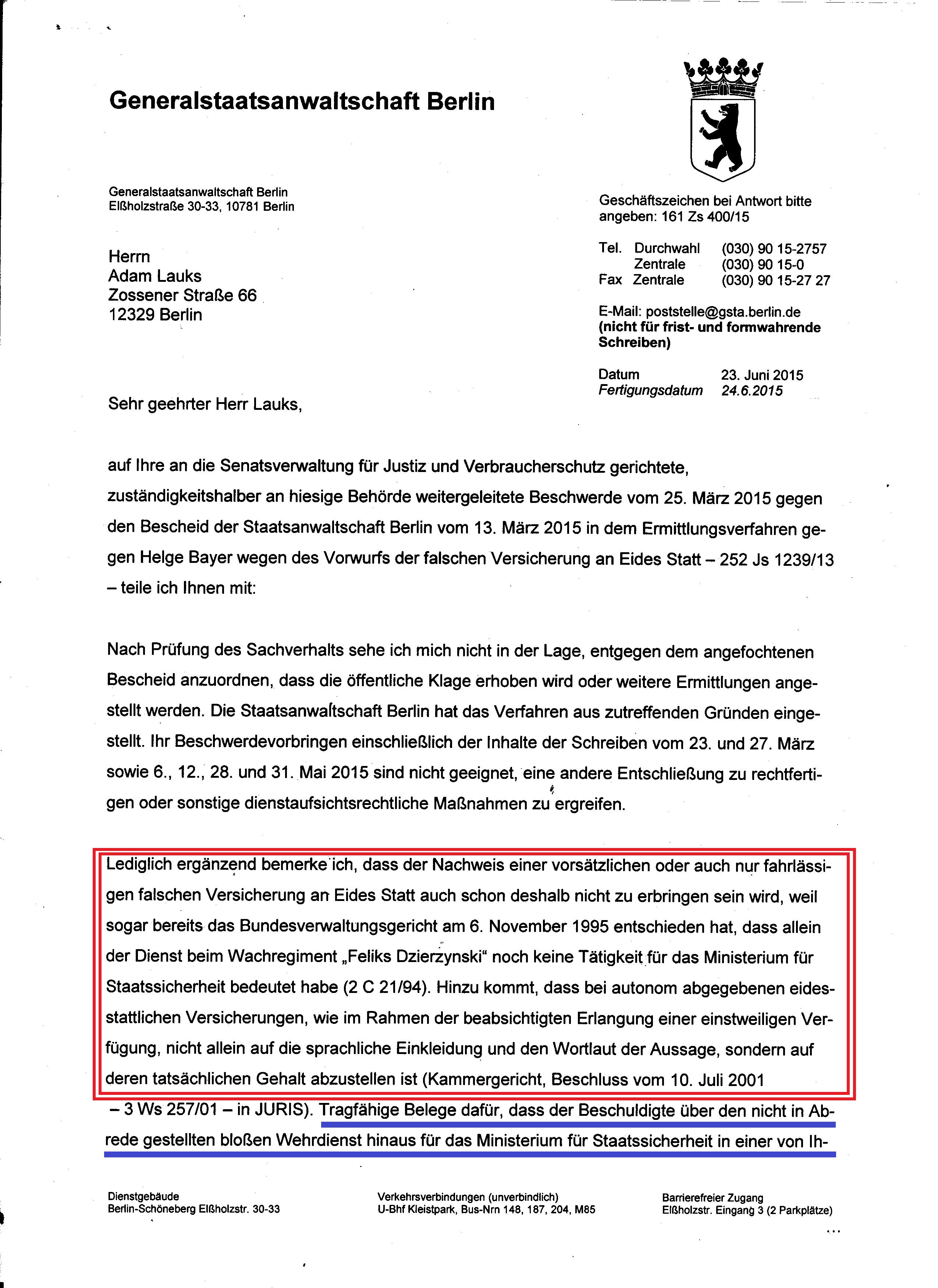 Nach 25 Jahren „Aufarbeitung “ der BStU und des klaren StUG ist es bis zur Staatsanwaltschaft Berlin und auch nicht bis zur Generalstaatsanwaltschaft Berlin gänzlich durchgedrungen, daß ein Mitarbeiter des MfS der Jenige ist der ein Dienstverhältnis zum MfS eingegangen war… und RA Helge Bayer war ein Dienstverhältnis eingegengen!