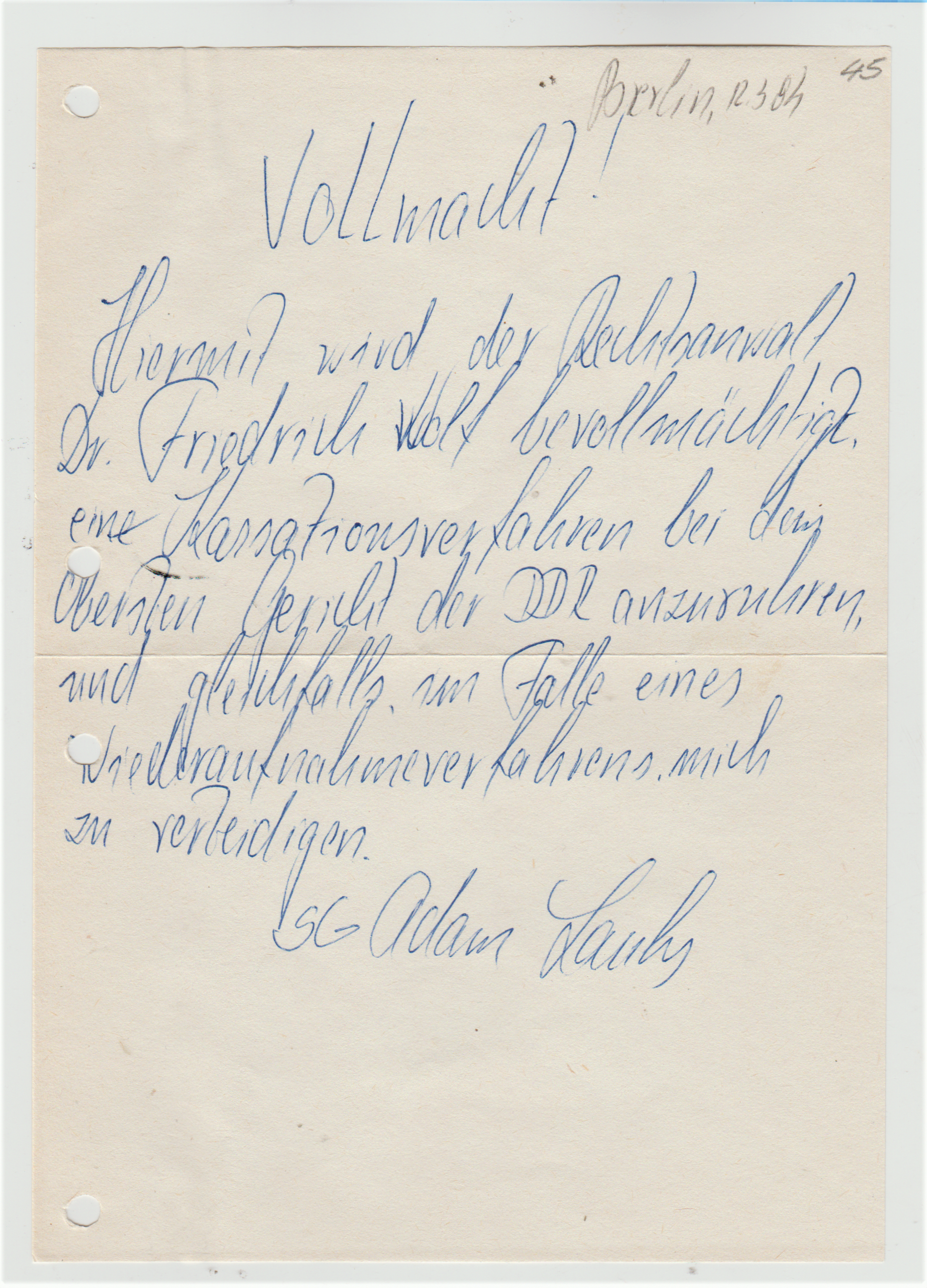 Vollmacht an RA Dr. Friedrich Wolff 12.3.84 vom MfS kassiert