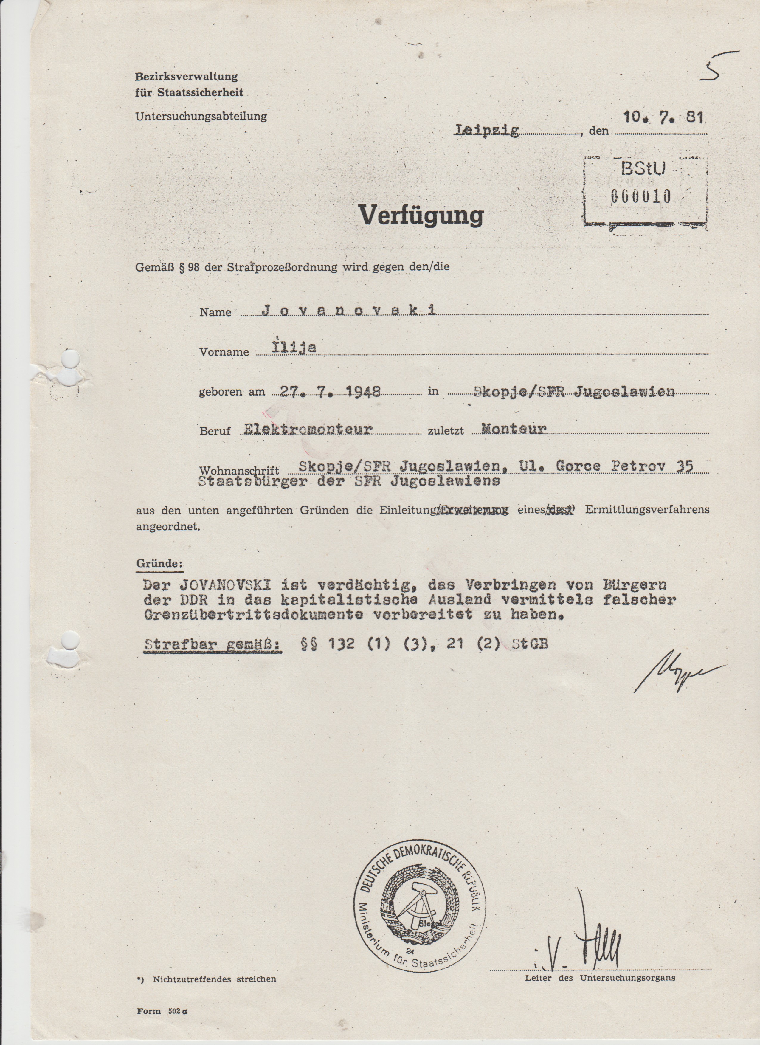 Leiter der Bezirksverwaltung General nHumitzsch kam in die U-Haftzelle von Ilija Jovanovski und stellte sich als Erich Mielke vor…er steckte 100.000 DM ein die in keiunem Beschlagnahmeprotokoll erschienen.