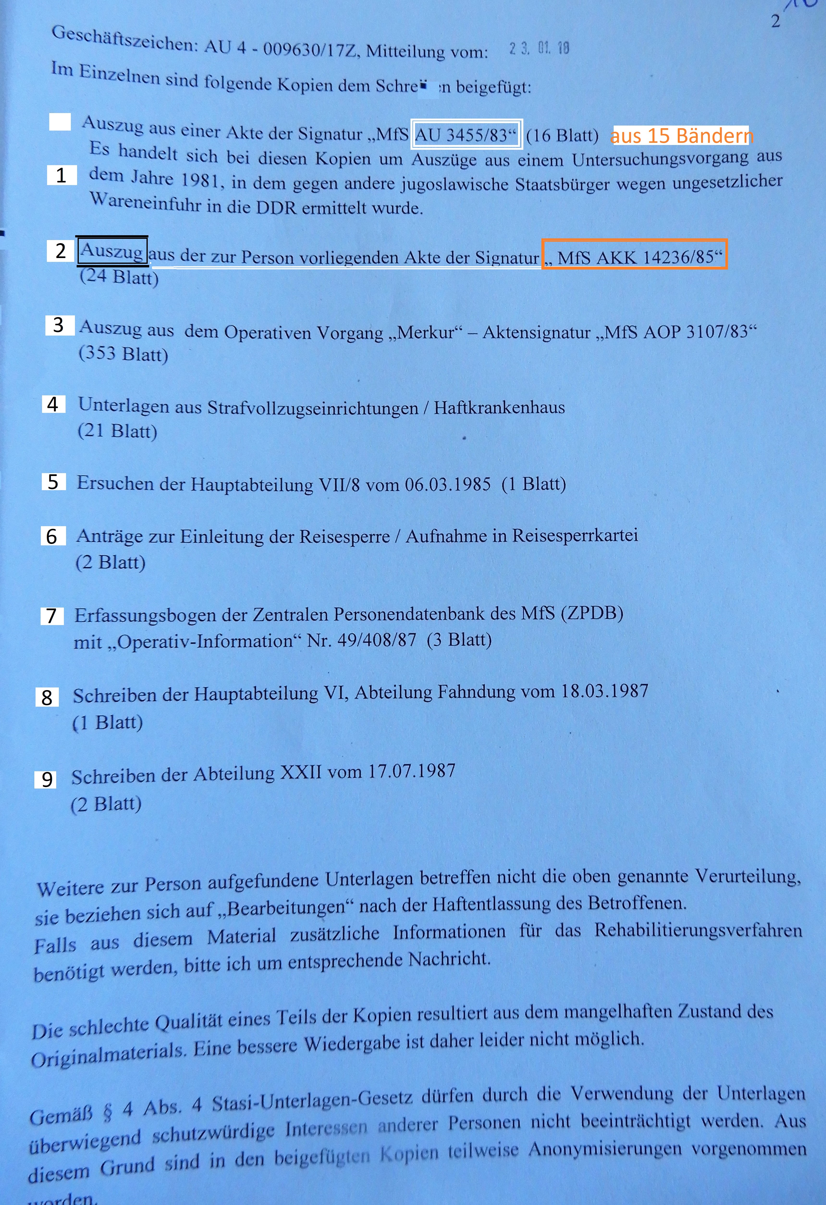 Blatt. d. Akte 161 – verschwand aus der Gerichtsakte – es wurde seitens der Richterin kein Nachforschungsantrag gestellt – weil die Akte die Generalstaatsanwältin Koppers und ihre Helferin OStA Schmitz – Dörner gestohlen haben um die BStU wegen Urkundenunterdrückung nicht anklagen zu müssen. Nämlich in der Postition 3 sind Vernehmungen der STASI die eindeutig Bestandteil der verleugneten Prozessakte sind, die BStU nicht herausgeben will oder darf, denn Befehl lautet: Nebst 22000 übernommenen MfSler soind auch die übernommenen rechtsbeugende Richter und Juristen zu schützen.