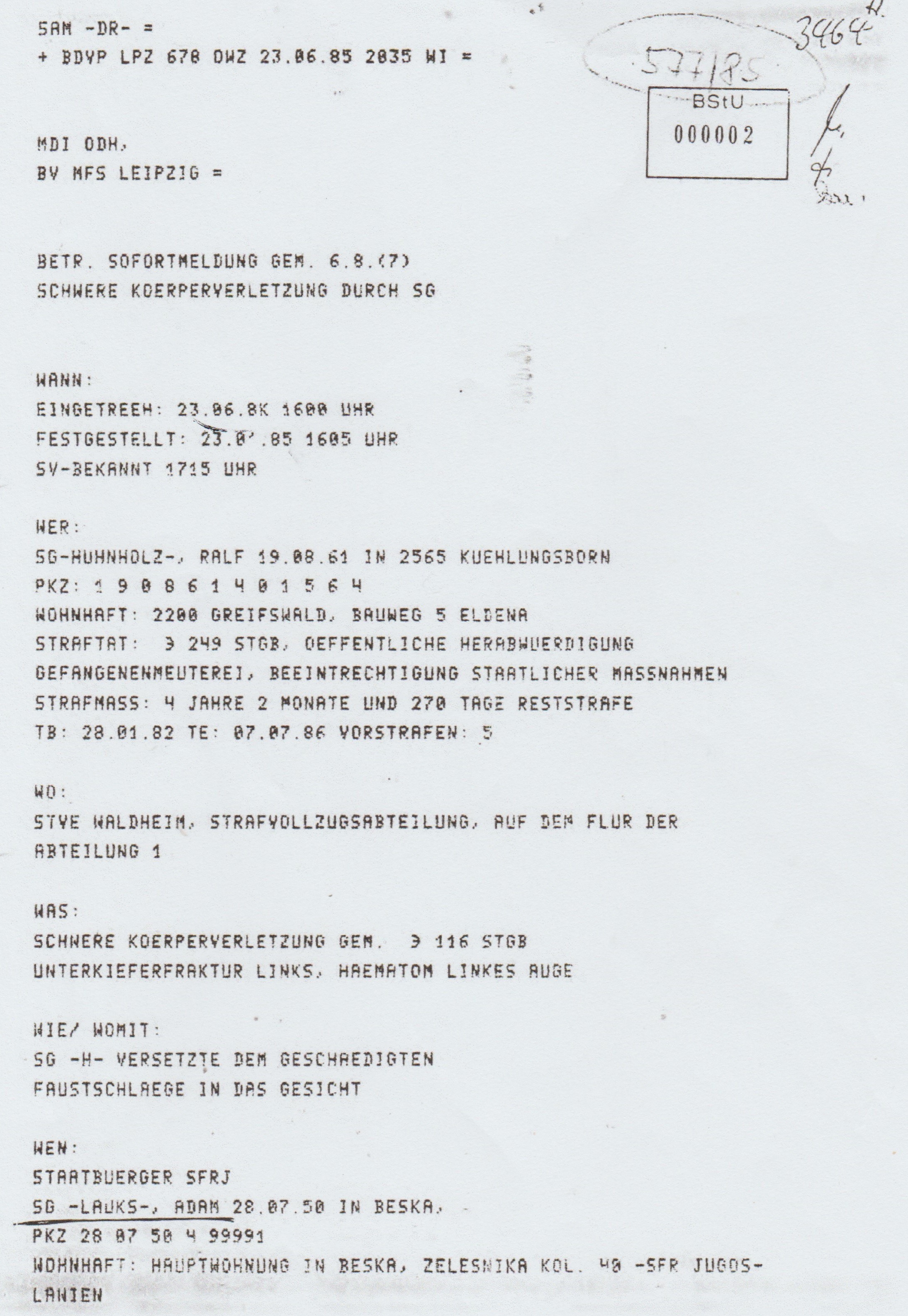 Die Kopie des Origials des Aktesegmetes der Akte MfS HAVII/8 577/85 die die BStU versehentlich a das VG illegal nachgeschoben hatte, ohe das darüber einGewaltenteilung Vermerk in die Ate eigetragen wurde?!?