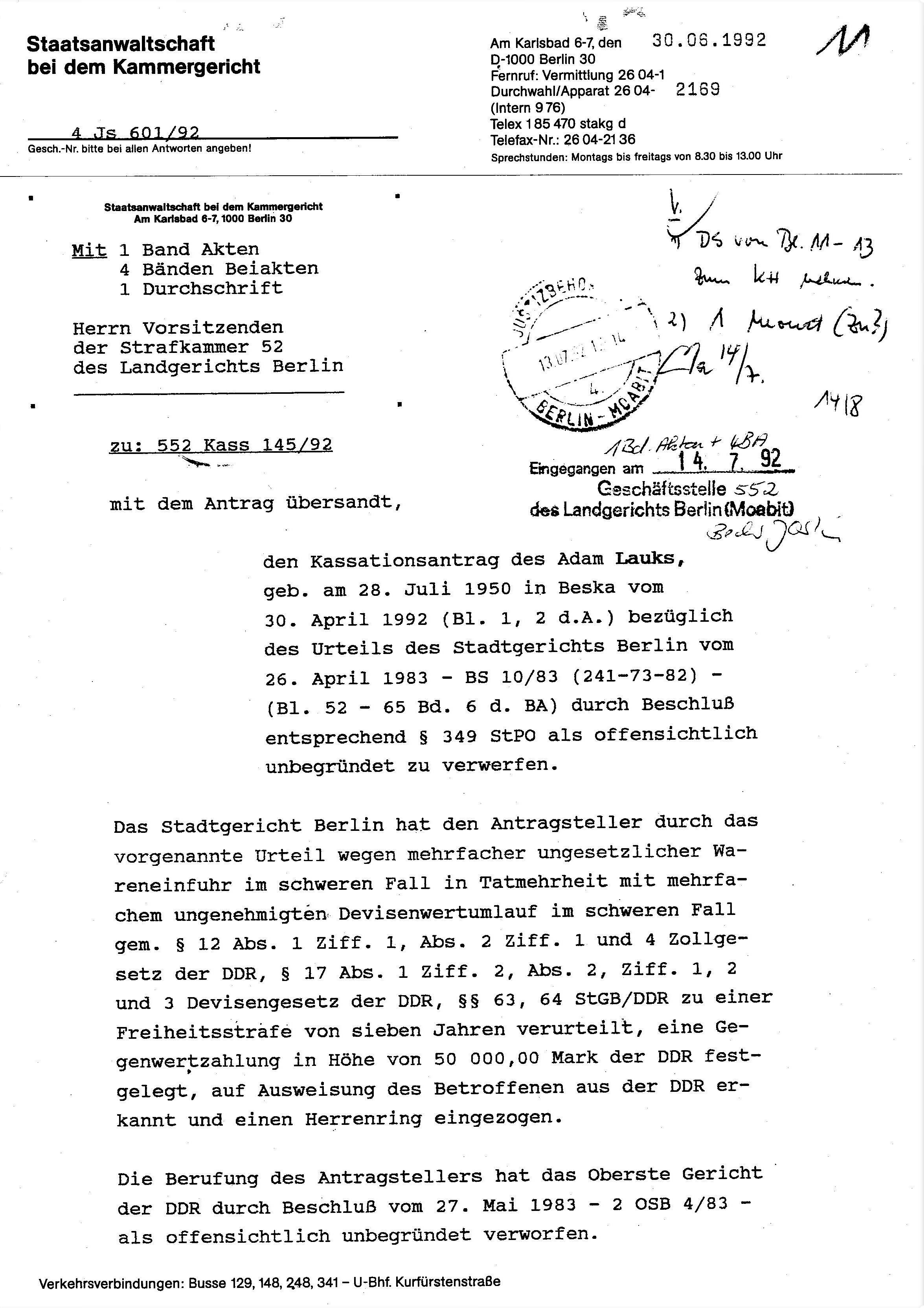 552 Kass 145/92 des Folteropfers der STASI Adam Lauks alias "Merkur