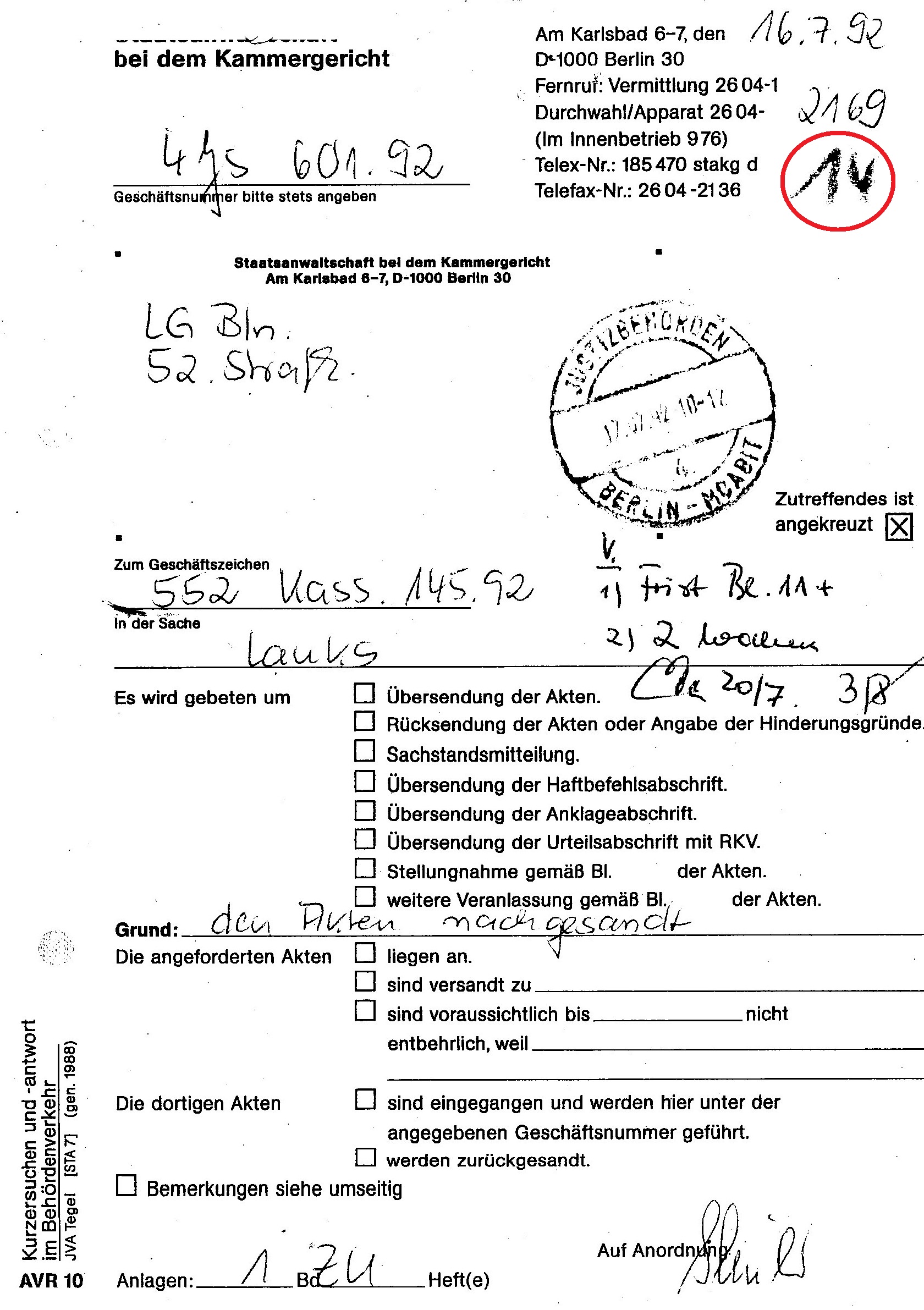 552 Kass 145/92 des Folteropfers der STASI Adam Lauks alias "Merkur