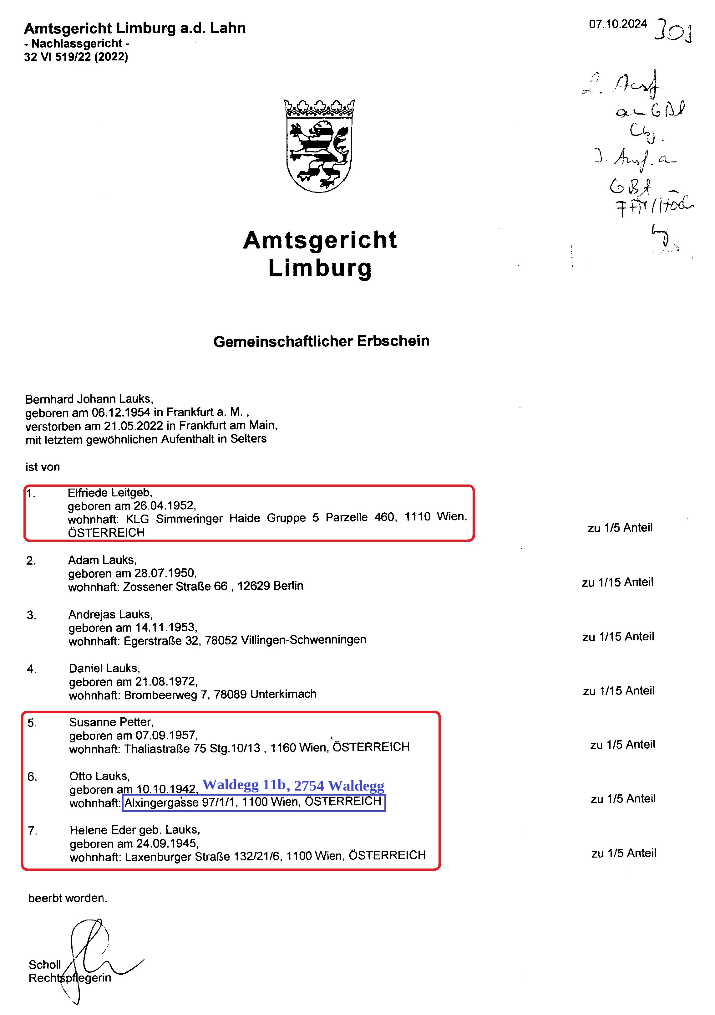 „Post ist unterwegs. […] Anlagen: Erbenliste (Blatt 96/97), inkl. Otto Lauks, Waldegg 11 b, Österreich.“